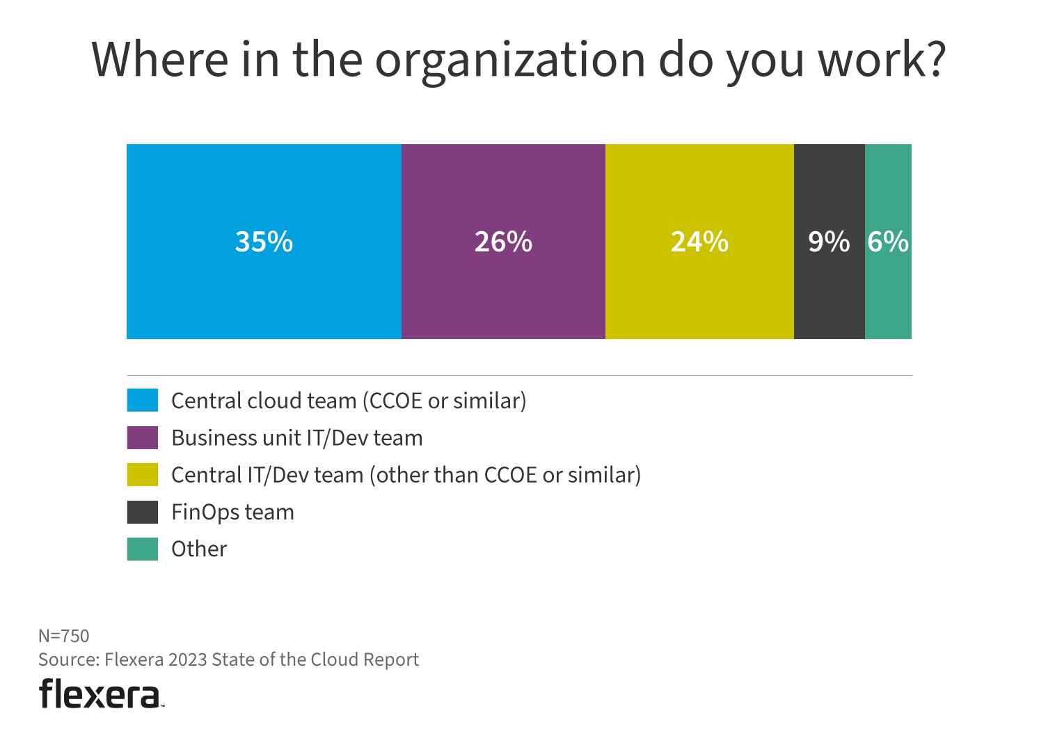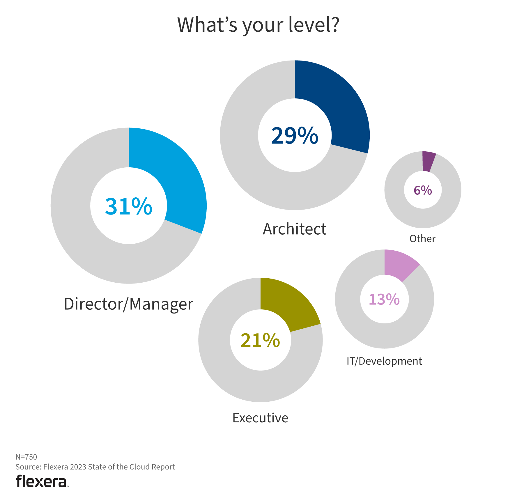 The following figures indicate the breakdown of respondents by business role, level and where they work within their organization. The majority (59%) are close to the cloud, either as IT/operations (44%) or cloud architects (15%). This is the first year we asked whether respondents were part of a FinOps team (9%) and if their organization has a FinOps team (72%).