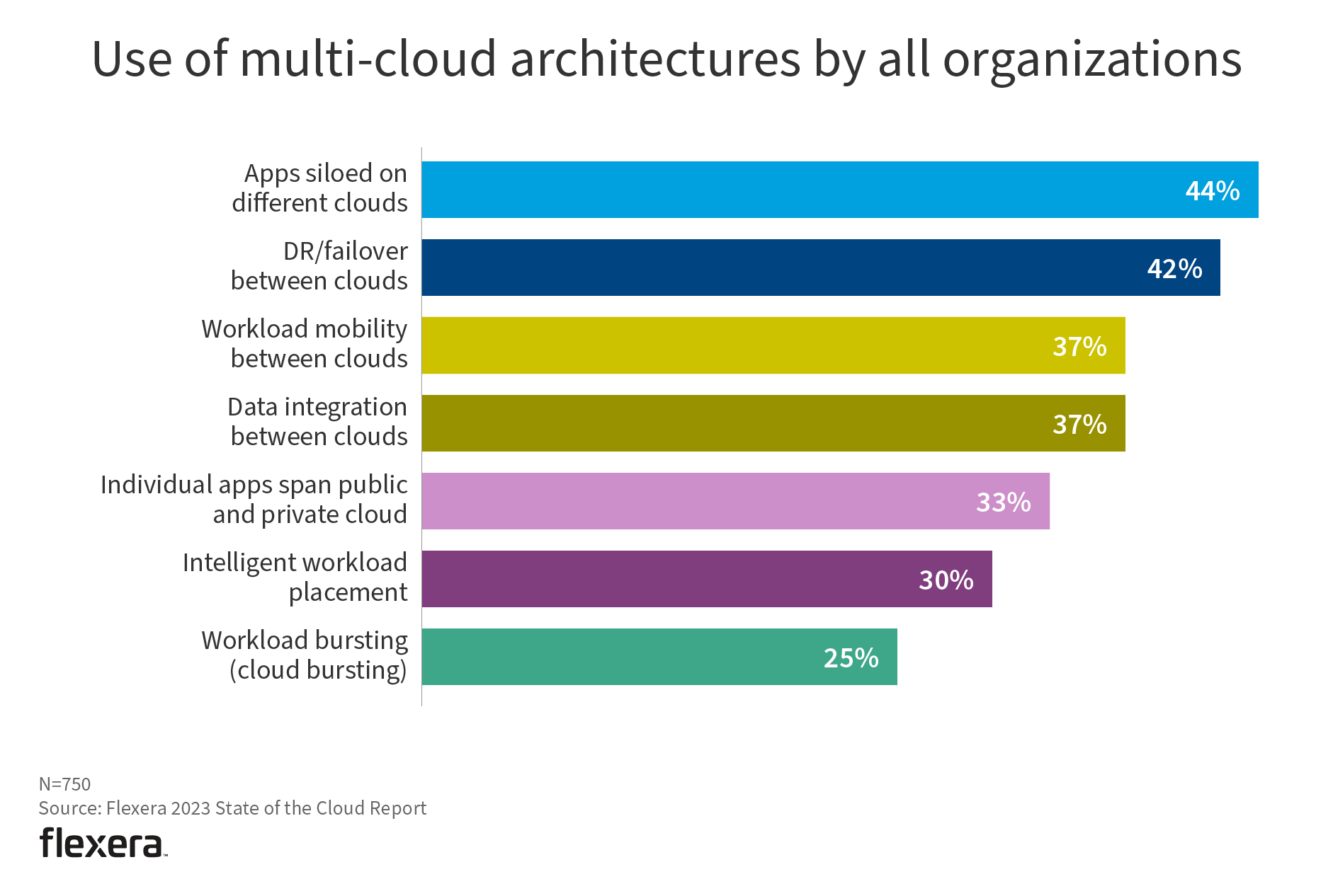 Apps siloed on different clouds and DR/failover between clouds have remained the top two multi-cloud implementations. Intelligent workload placement is increasing the fastest (up 20 percent year over year).