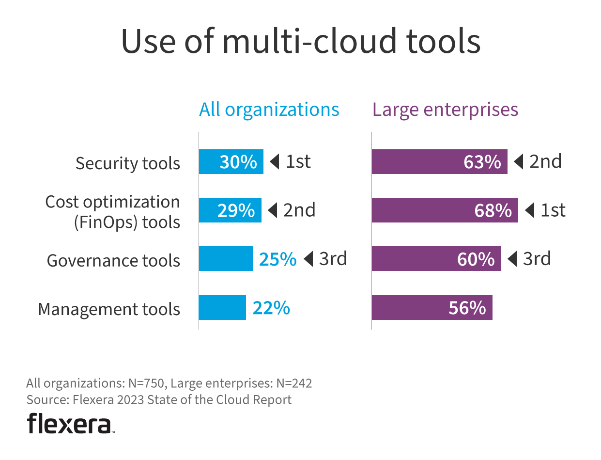 Across the board for all organizations, multi-cloud security tools continue to lead, followed closely by multi-cloud cost optimization (FinOps) tools. However, large enterprises reverse the order, with 68% using multi-cloud FinOps tools and 63% using multi-cloud security tools.