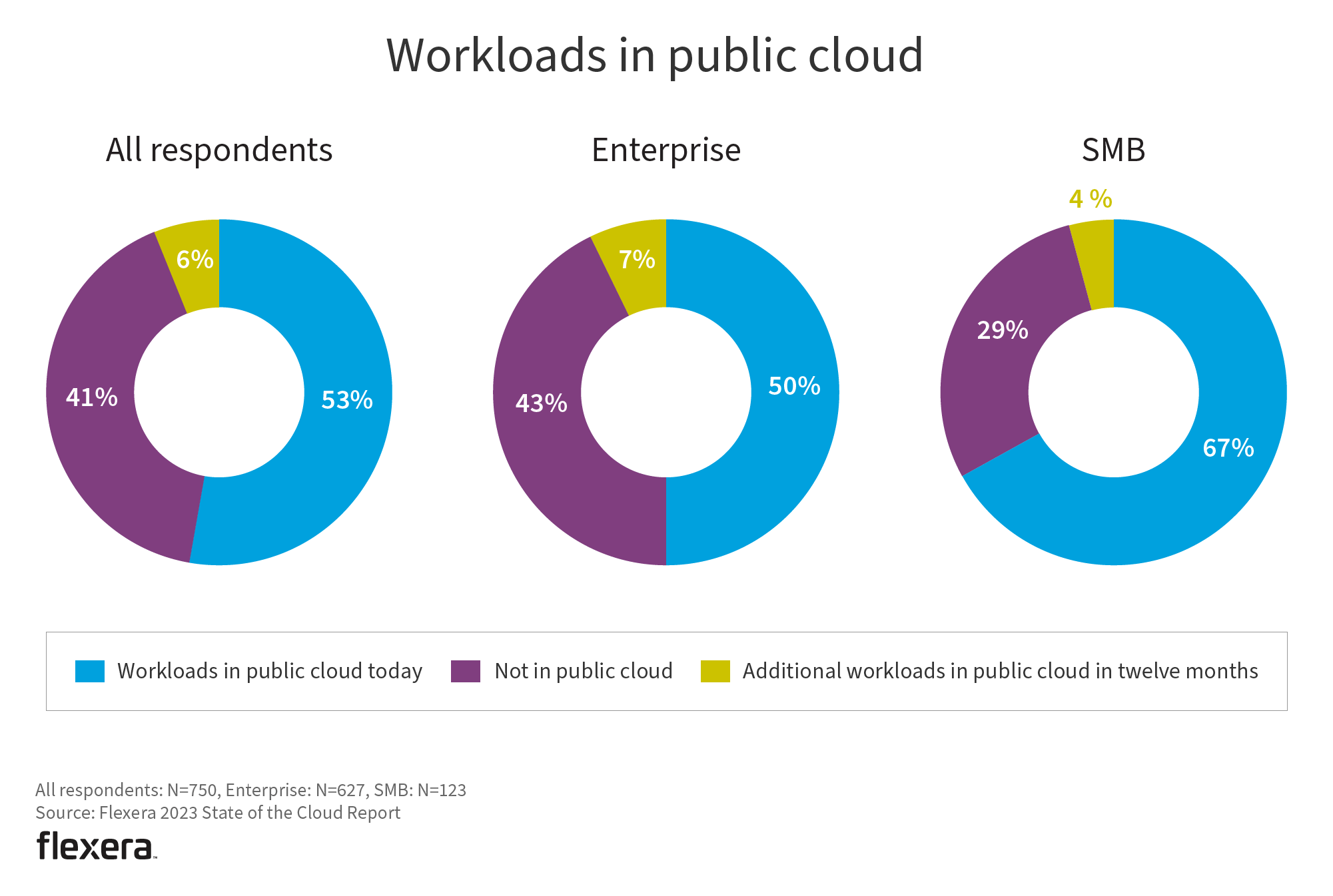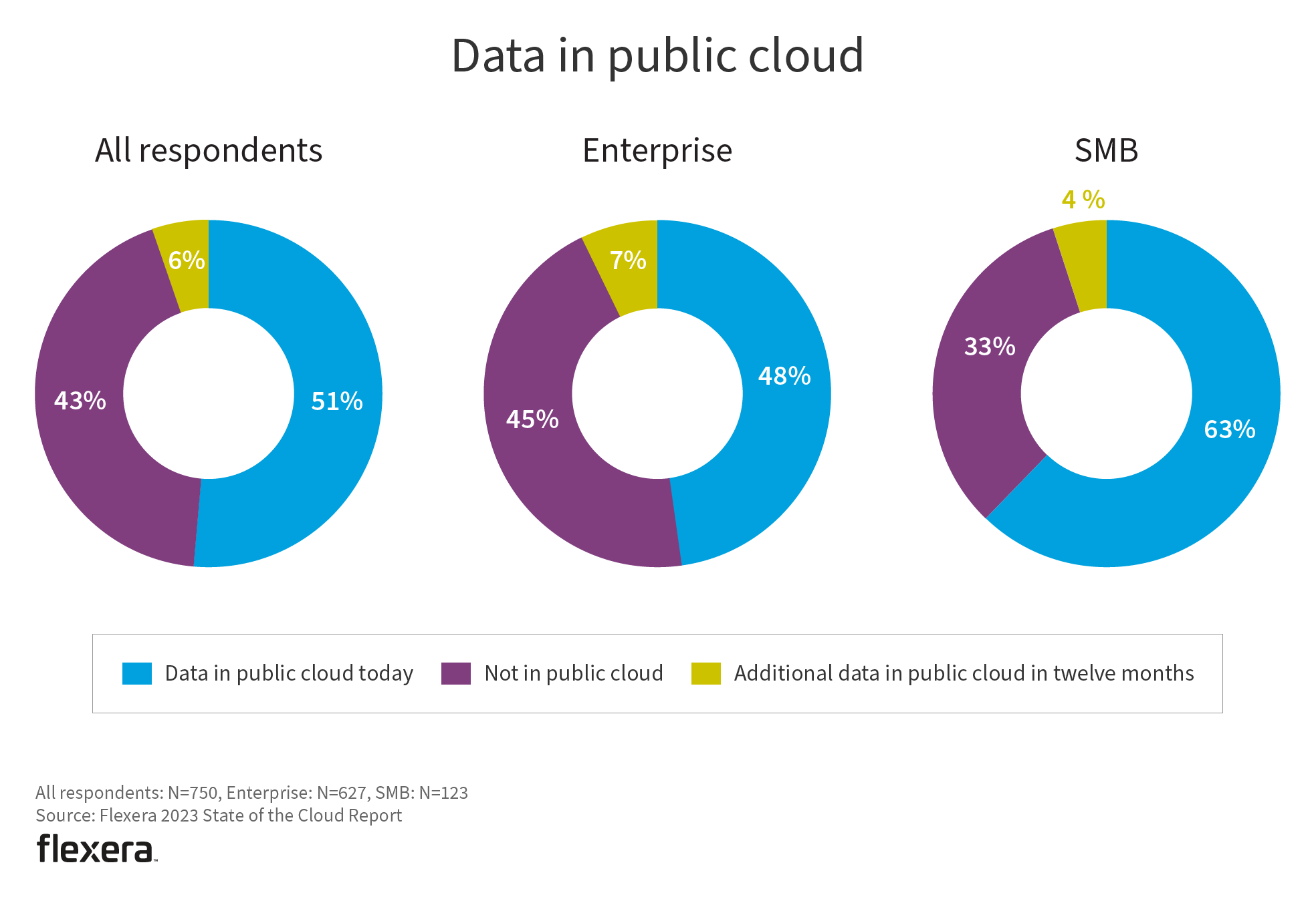 For all respondents, more than half of workloads and data are in public cloud today. Enterprises, which have more complex environments and tend to move more slowly, have 50% of workloads and 48% of data in public cloud.