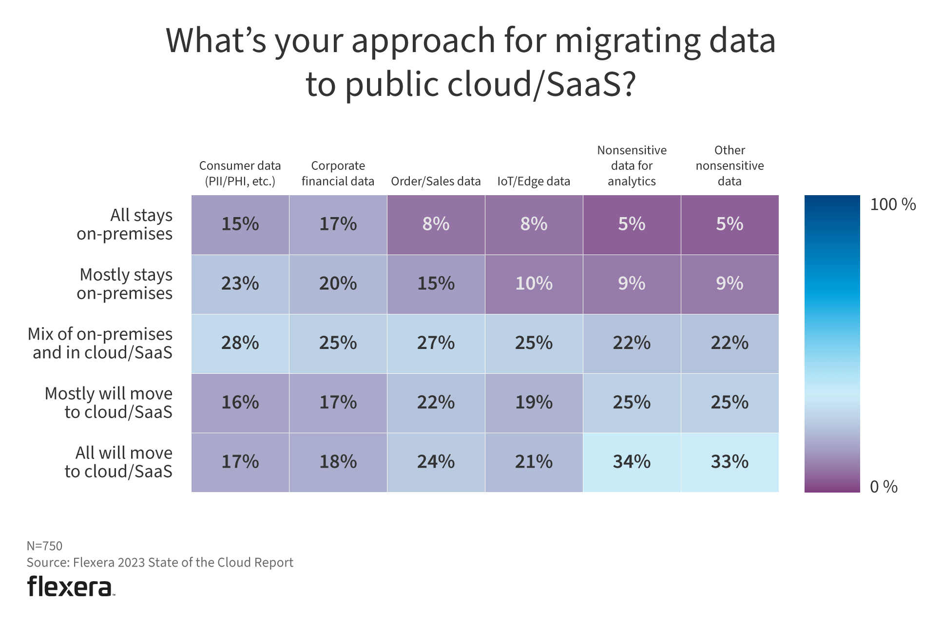 More than half of respondents said they’ll consider moving at least some sensitive consumer data or corporate financial data to the cloud. Seventeen percent said all sensitive consumer data will move to cloud/SaaS (up from 13% year over year), and 18% said all corporate financial data will move to cloud/SaaS (up from 11% year over year).