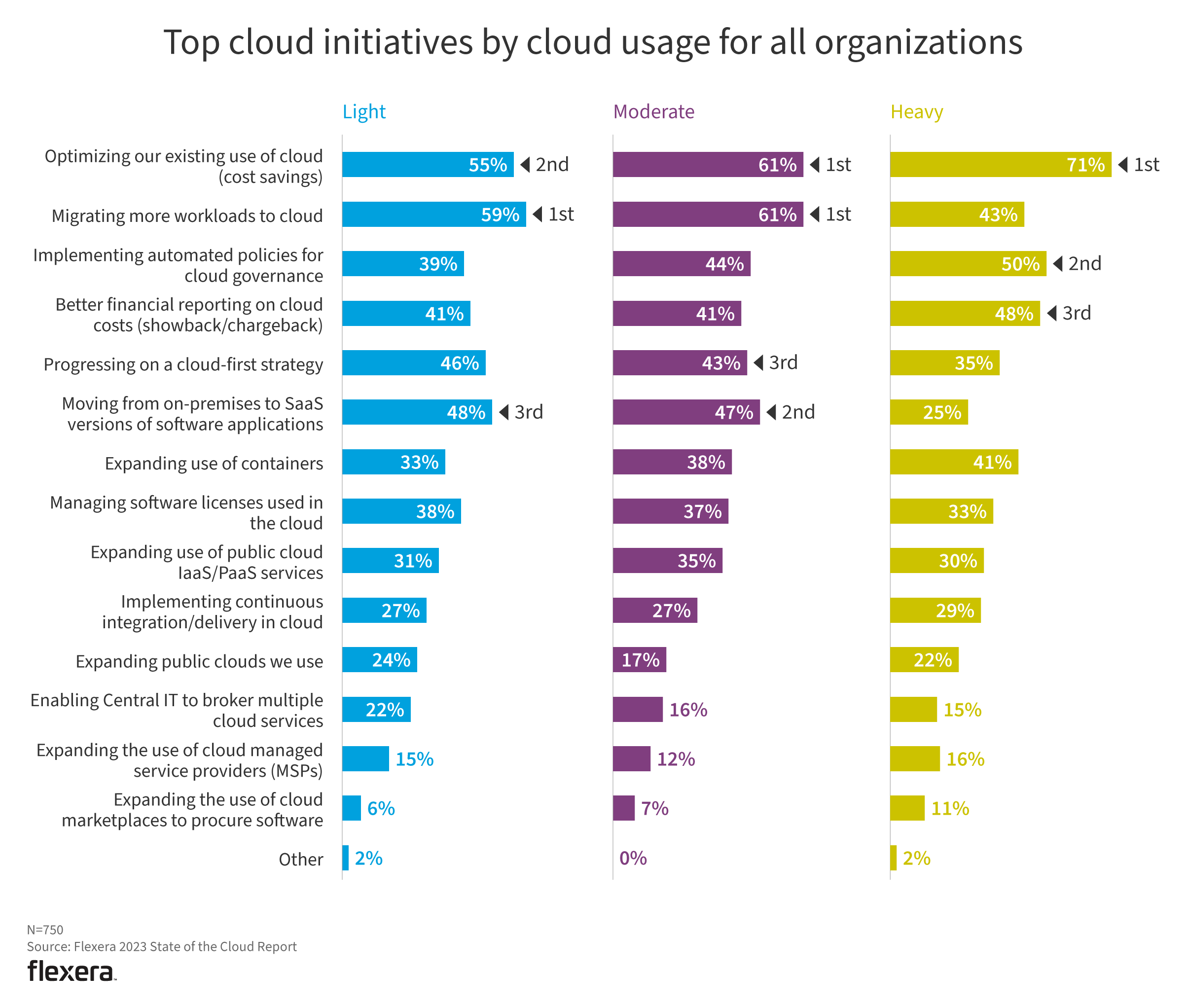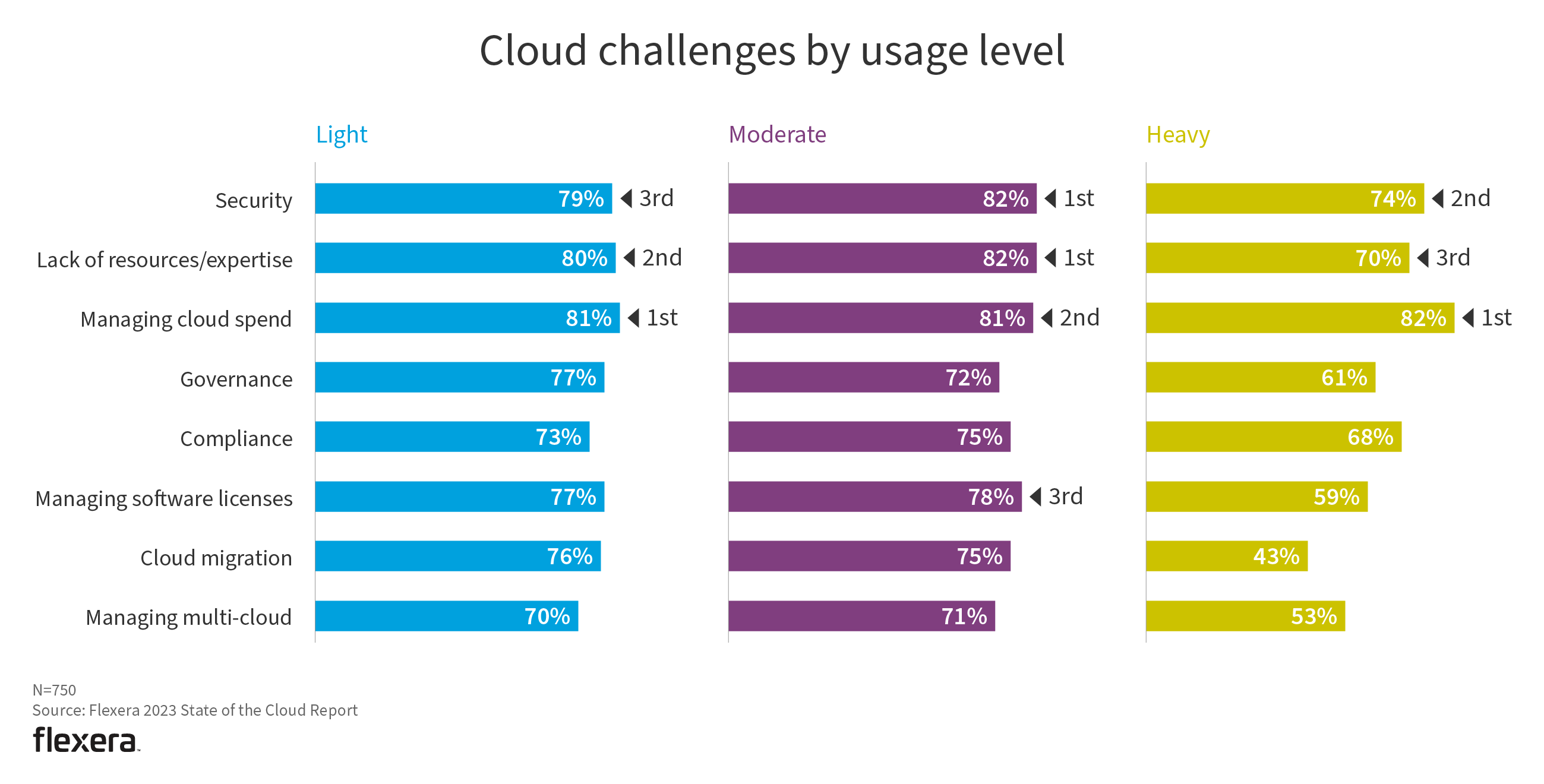 Managing cloud spend is a top challenge across usage levels. As organizations mature, certain functions mature as well. Respondents indicated governance, compliance and managing software licenses have become less of a challenge.
