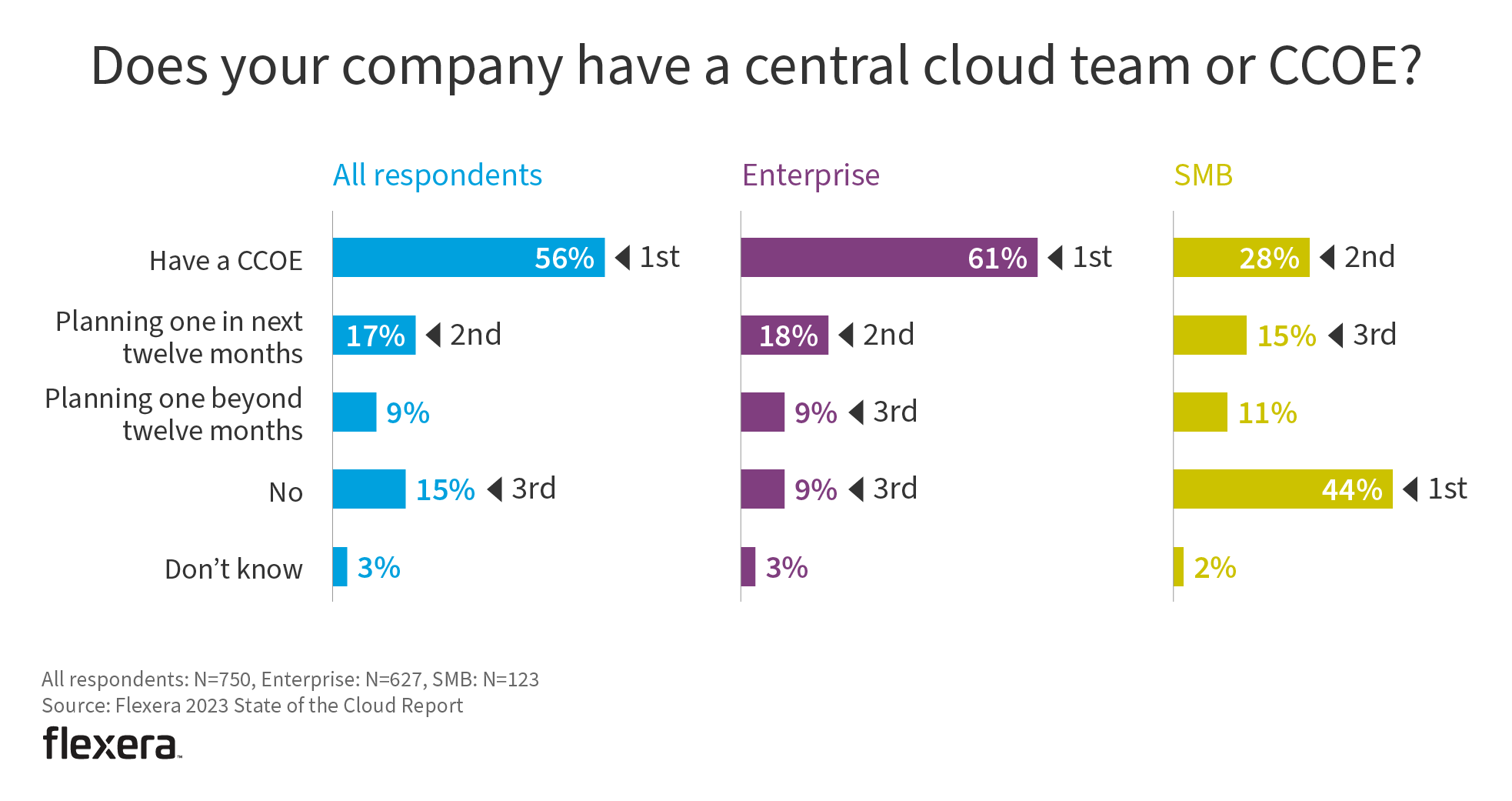 Most organizations have a CCOE (56%) or plan to within the next year (17%). Not surprisingly, enterprises (61%) are more likely than SMBs (28%) to have a CCOE.