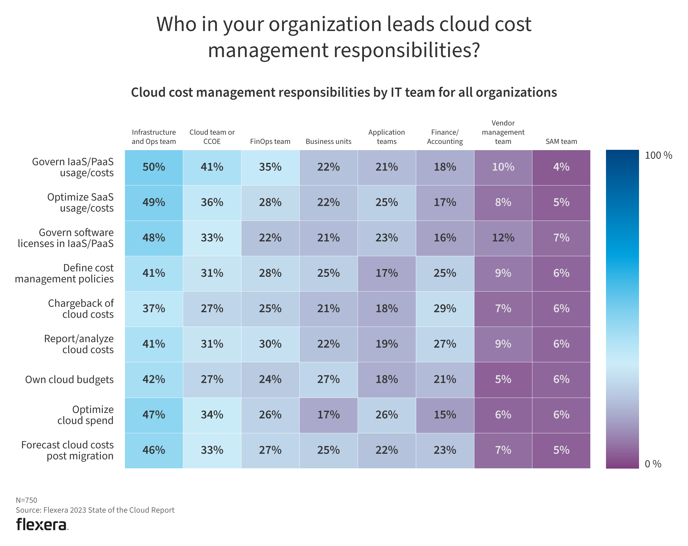 As usual, infrastructure and ops team and cloud team or CCOE lead the charge. Govern IaaS/PaaS usage/costs dropped to 41% from 53% year over year, while FinOps teams increased that responsibility to 35% from 24%.