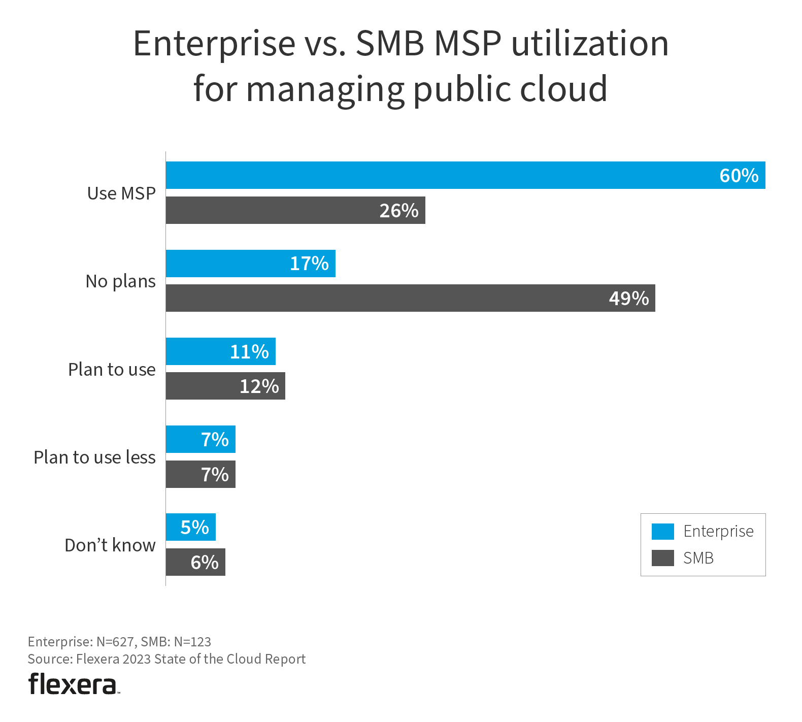 Enterprises are more inclined to utilize MSPs than SMBs (60% vs. 26%). This is expected as enterprises tend to have larger cloud environments and are more likely to have preexisting MSP relationships. On the other hand, SMBs tend to have simpler cloud infrastructures, including those that only use one cloud provider.