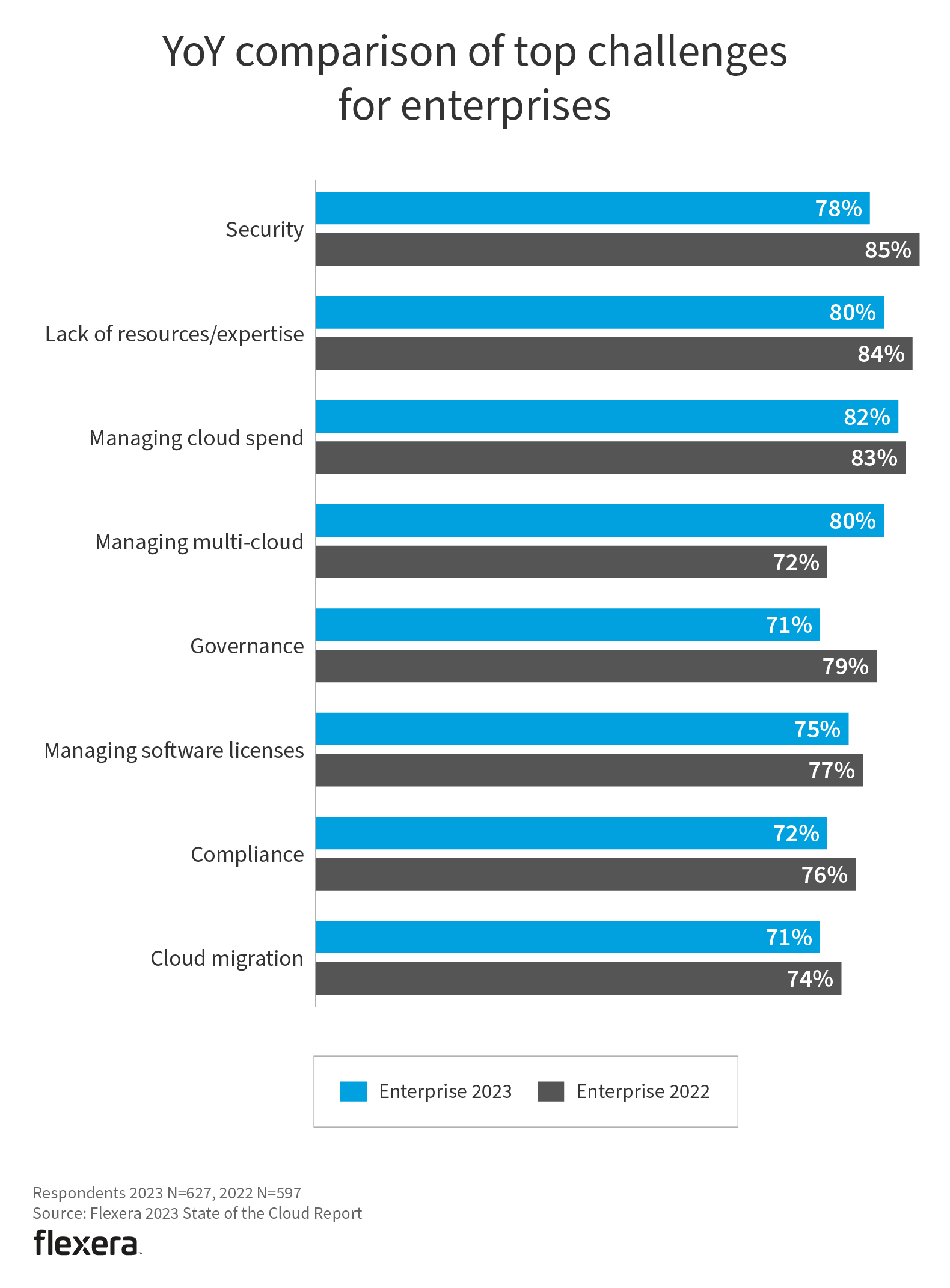 Interestingly, all challenges for enterprises decreased year over year with the exception of managing multi-cloud, which increased from 72% to 80%. As organizations consume more services from multiple cloud vendors, managing these bespoke services becomes more complex. Additionally, the percentage of enterprises facing security challenges has dropped from 85% to 78%.