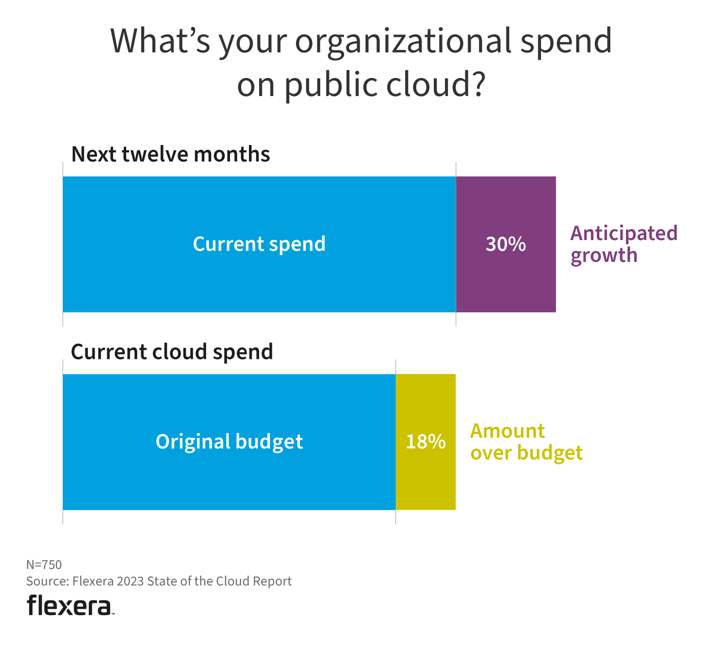 It’s easy to see why FinOps continues to evolve and grow as a cultural practice and financial management discipline. Public cloud spend was over budget by an average of 18%, up from 13% the previous year. Respondents remain bullish on cloud, as 30% expected spend to increase in next twelve months.