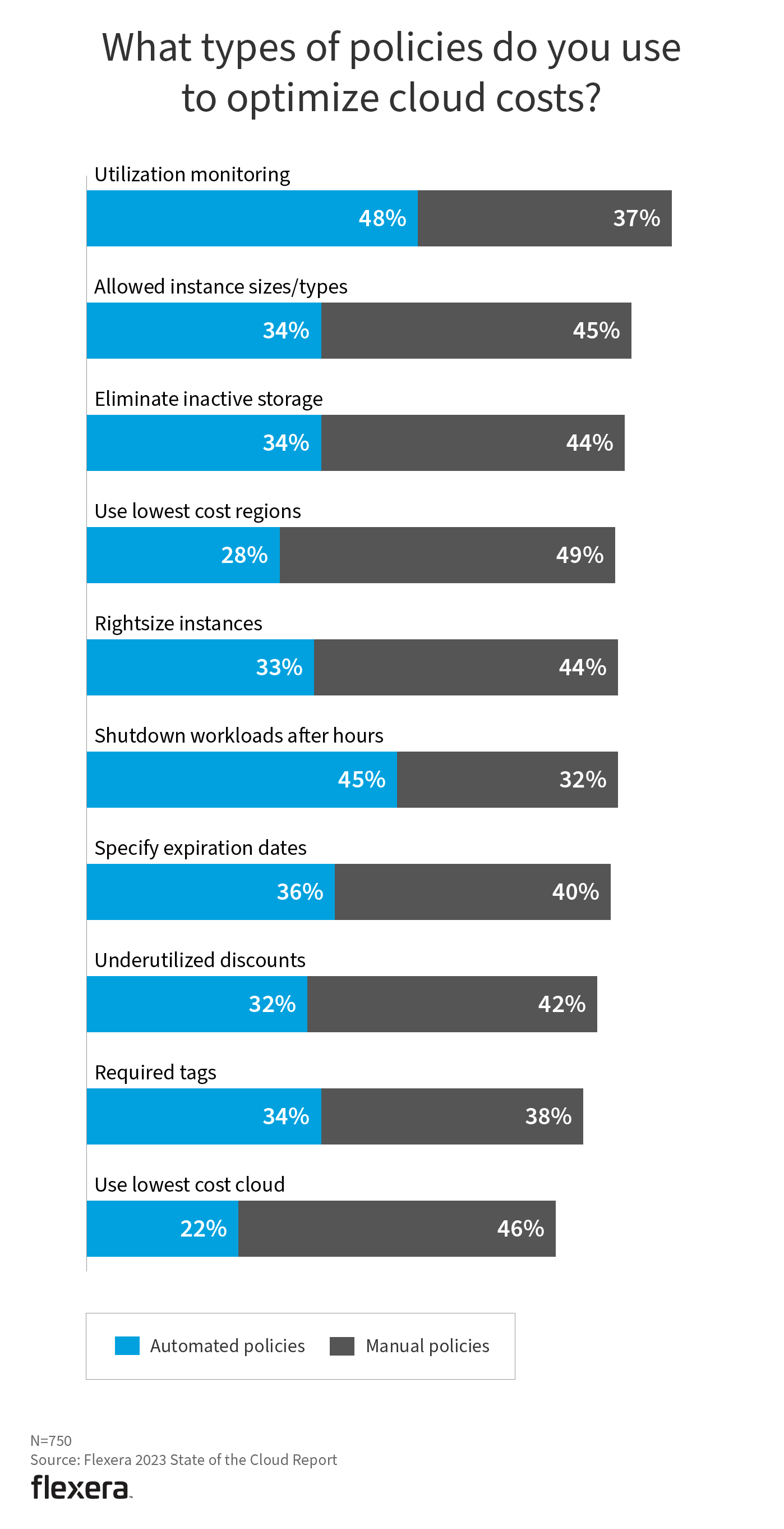 Automated policies such as utilization monitoring (48%) and shutting down workloads after hours (45%) are the most common, whereas using the lowest cost regions and allowing instance sizes/types are the most common manual policies. Surprisingly, nearly three-quarters of respondents still don’t leverage automated or manual policies for requiring tags, a critical way to allocate and optimize costs.