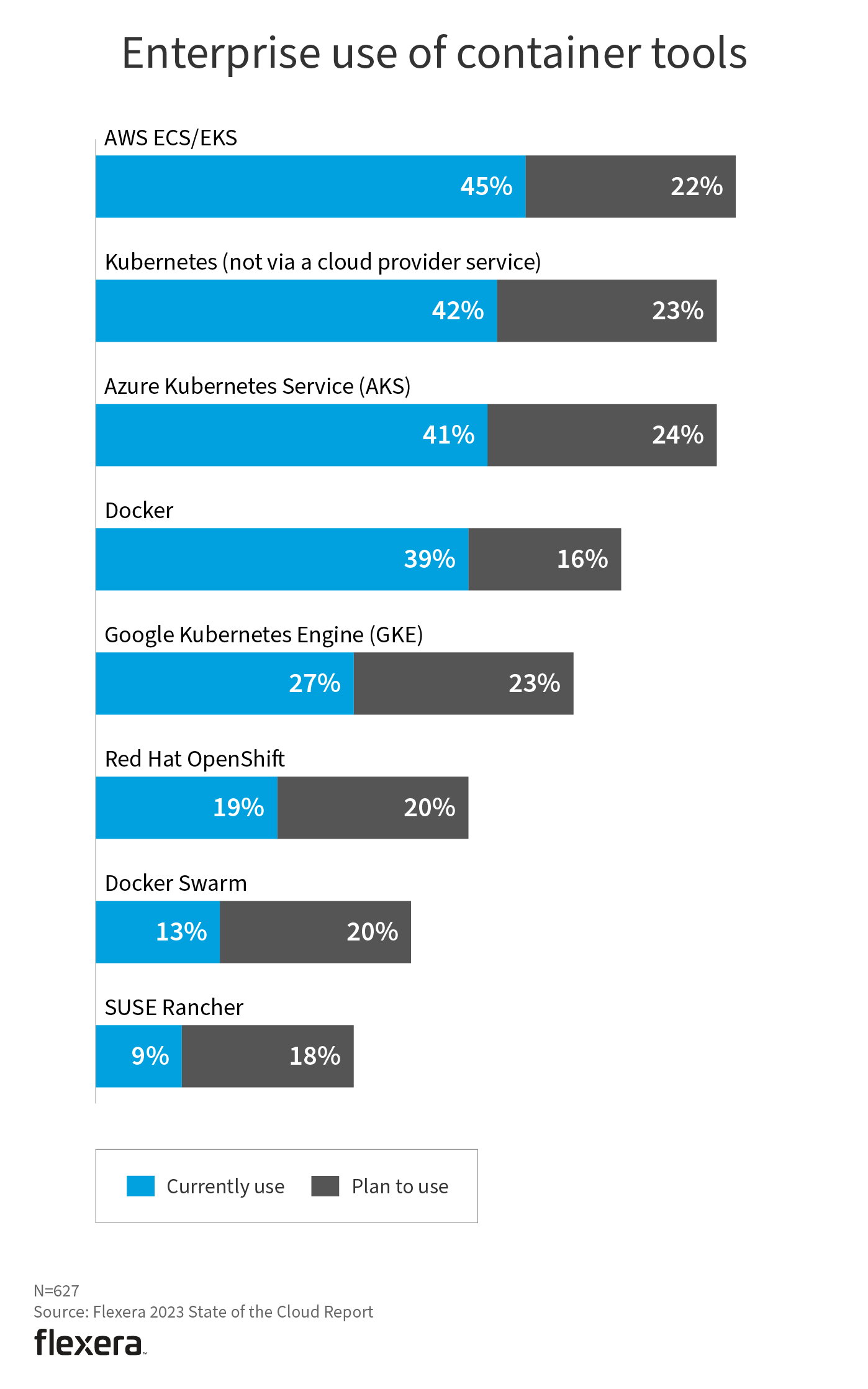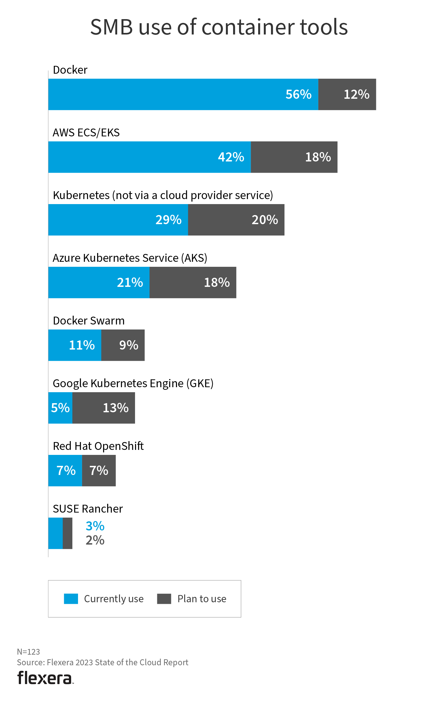 Native tools such as AWS ECS and AWS EKS are the most used container tools for both enterprises (45%) and SMBs (42%). Organizations are planning to use provider-specific, purpose-built tools along with growing interest in Azure Kubernetes Service (AKS) and Google Kubernetes Engine (GKE).