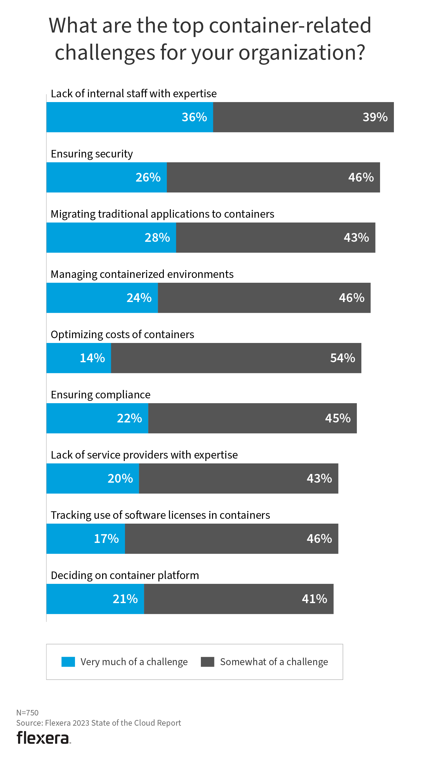 Overall, organizations named lack of internal staff with expertise (36%), migrating traditional applications to containers (28%) and ensuring security (26%) as very much a challenge related to container use. More than half of respondents (54%) named optimizing costs of containers as somewhat of a challenge.