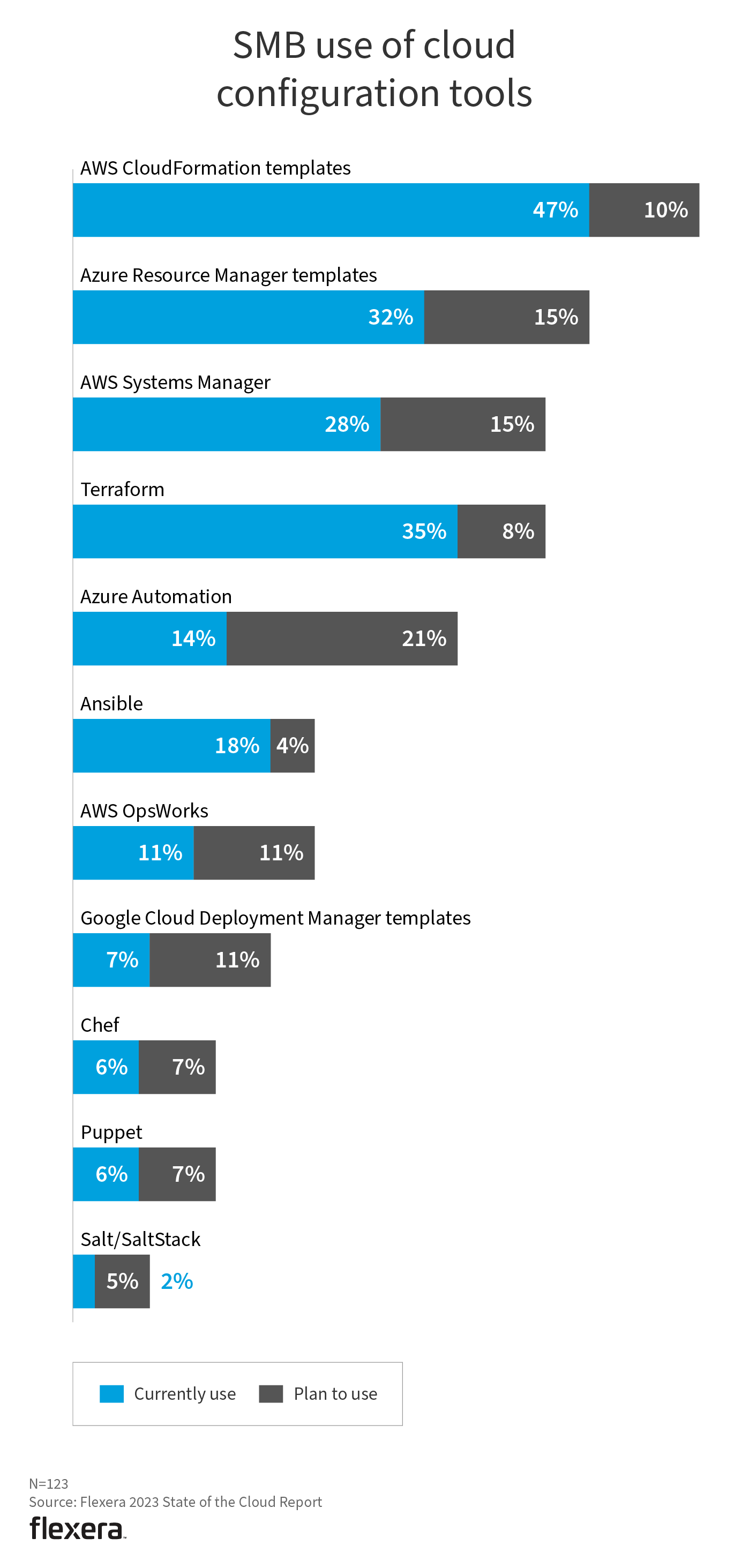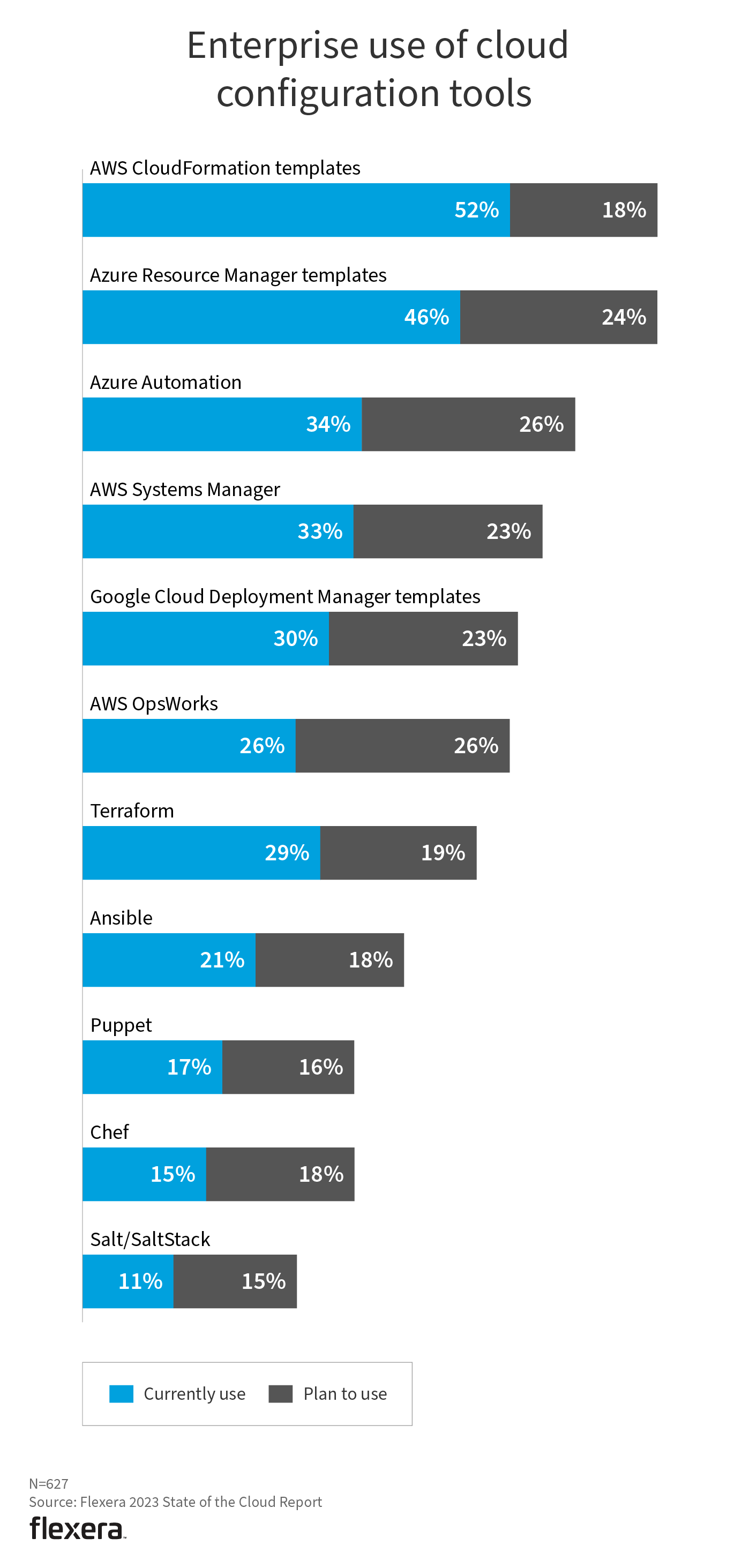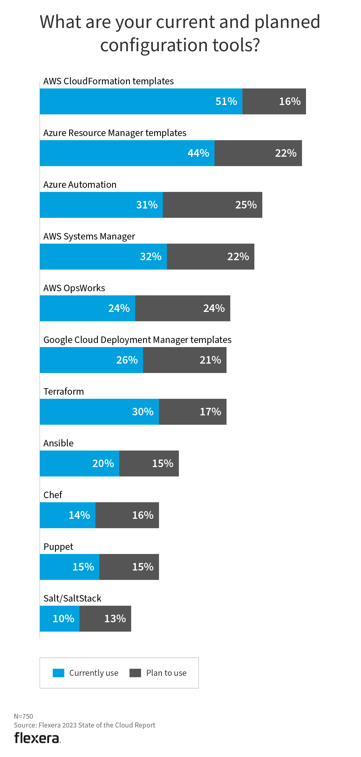 Native cloud tools—including AWS CloudFormation (51%), Azure Resource Manager templates (44%) and AWS Systems Manager (32%)—are most commonly used. This is the first year Azure Automation made the list, coming in at 31%, with the highest number of respondents (25%) planning to use. Cloud provider tools are well suited to their respective environments.
