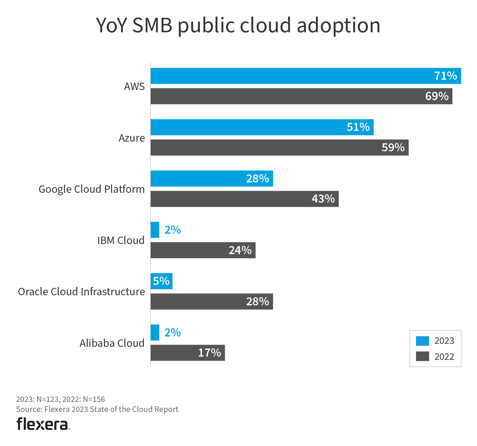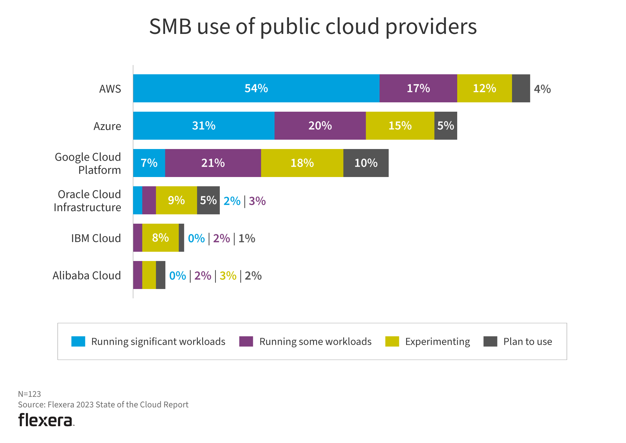 Additionally, usage of all other cloud providers has significantly decreased among SMBs, indicating that they’re increasingly choosing to use either AWS or Azure.
