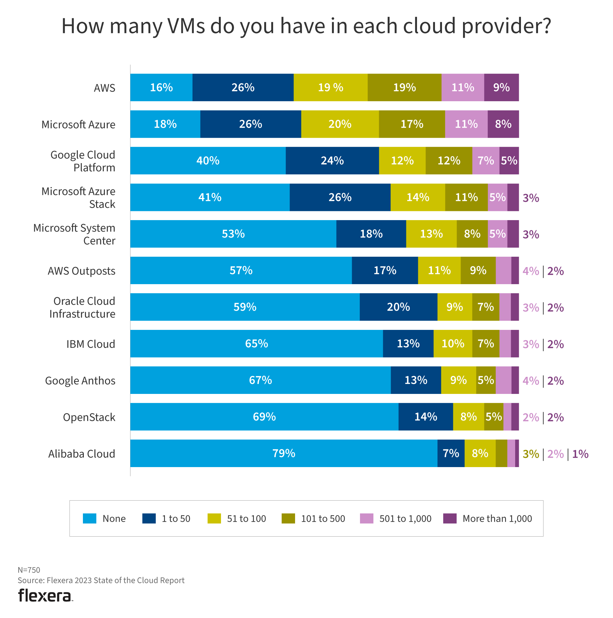 The number of virtual machines (VMs), or instances running in each cloud, provides additional insight into the size of an organization’s footprint within them. AWS and Microsoft Azure lead among the larger footprint sizes of 500+ instances. Microsoft Azure Stack has more large-footprint deployments than either AWS Outposts or Google Anthos.
