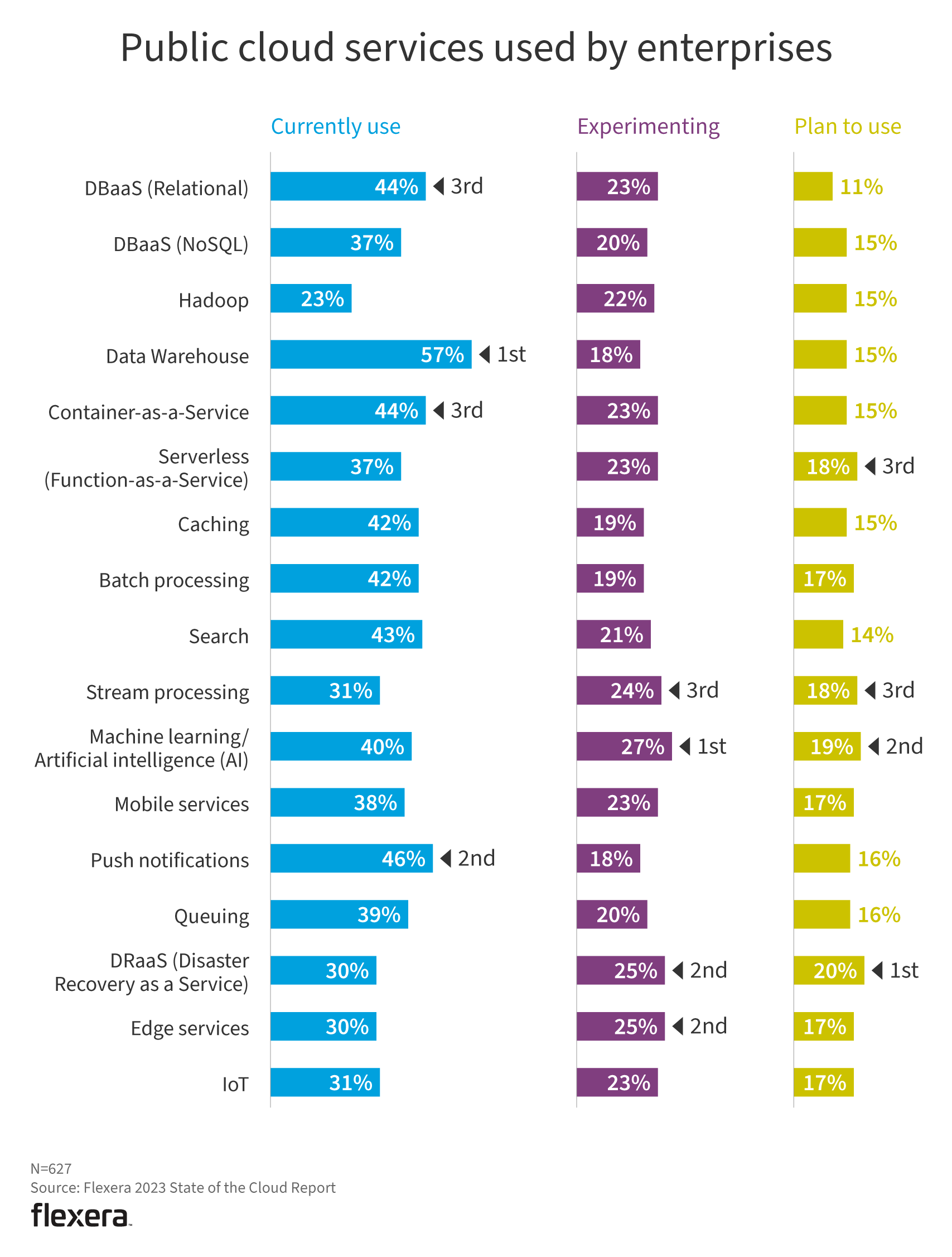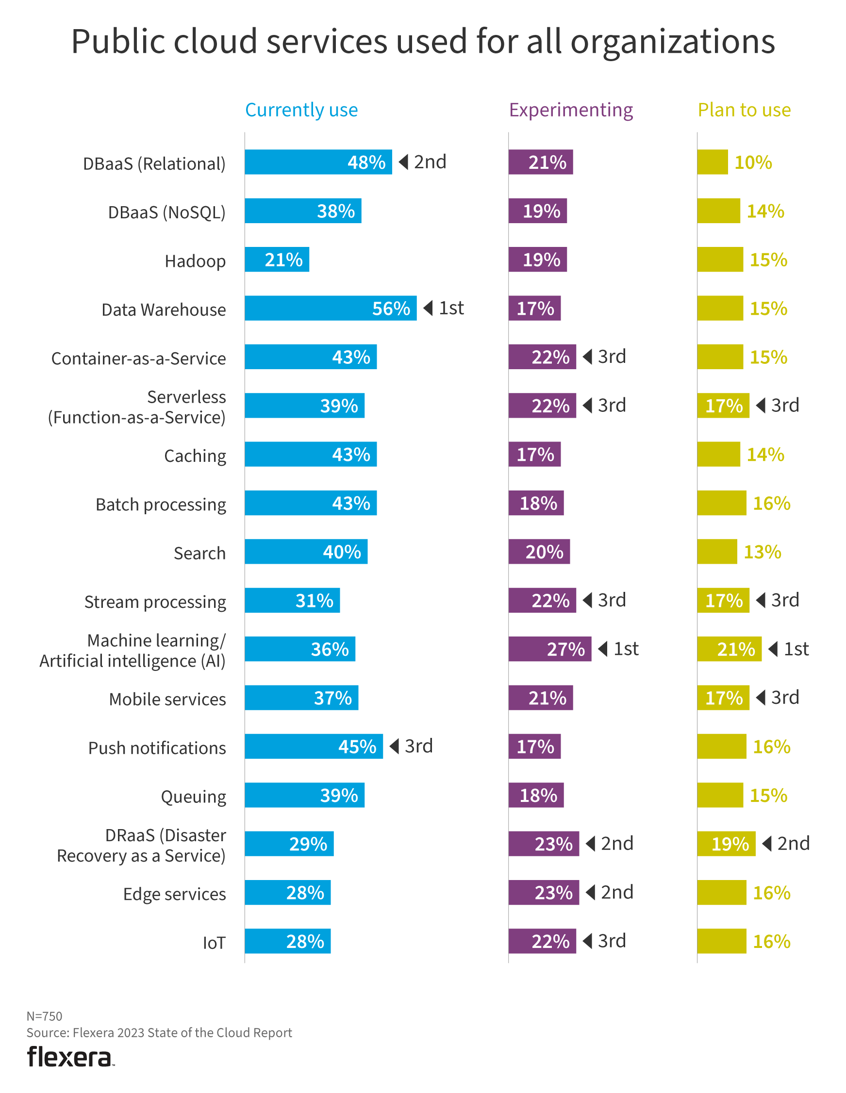 Similar to last year, data warehouse is the most commonly used PaaS offering, followed by DBaaS (relational). Machine learning/artificial intelligence is being experimented with more than any other service and, not surprisingly, it’s the leading PaaS offering that is being planned to use.