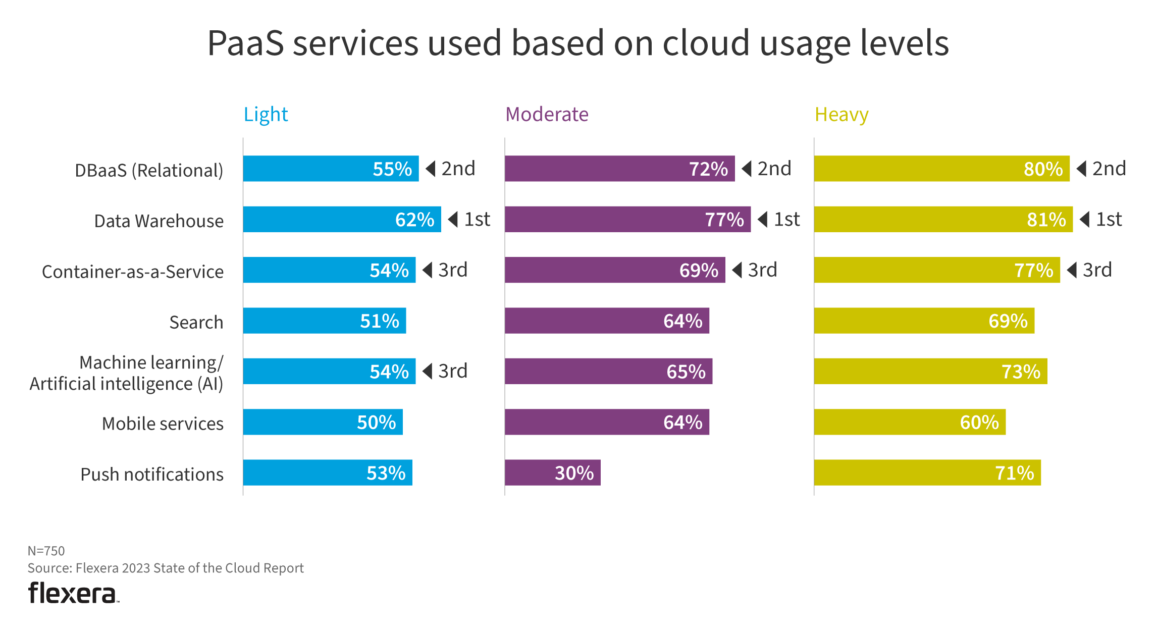 Organizations continue to increase their use of PaaS services as overall cloud usage rises. Data warehouse, DBaaS (relational) and container-as-a-service lead the pack with heavy users.