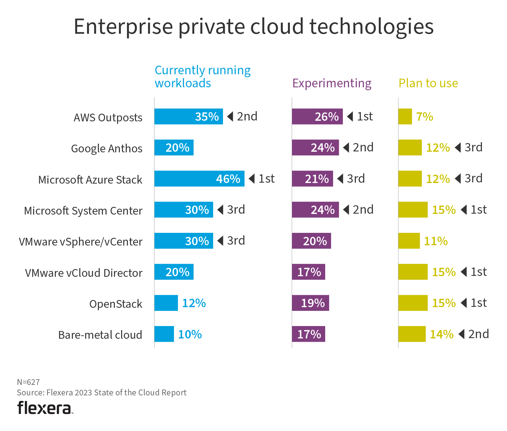 Most organizations are taking a multi-cloud, hybrid approach in which private cloud plays an essential role. Microsoft Azure Stack ranked first, with 41% currently running workloads, up from 37% last year. AWS Outposts switched places with VMware vSphere/vCenter for second place. Others remain relatively unchanged, with the exception of OpenStack, which continued its downward slide the last few years, dropping to 11% this year from 15% past year.