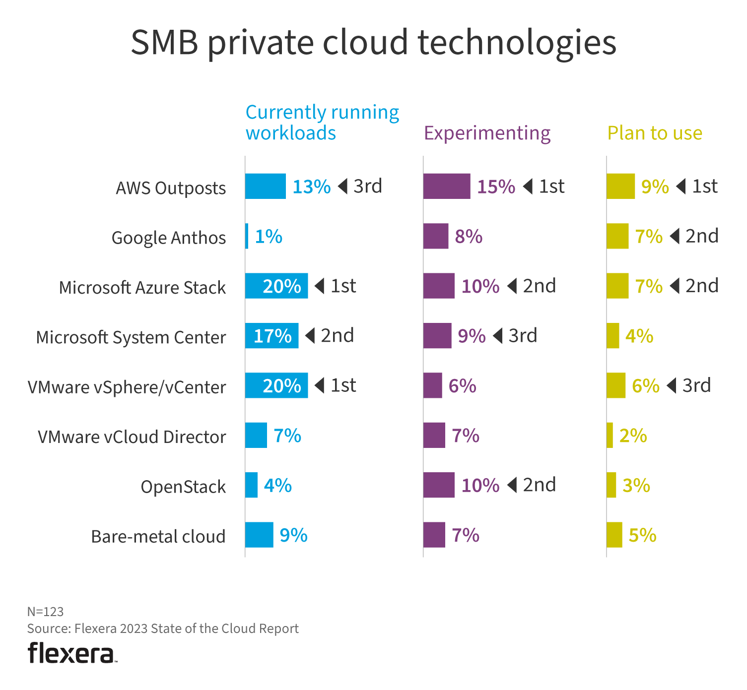 Microsoft System Center and Microsoft Azure Stack remain in or near the lead for SMBs. Still, VMware vSphere/vCenter made slight gains this year to move into a tie for first. OpenStack and Google Anthos saw significant decreases this year.