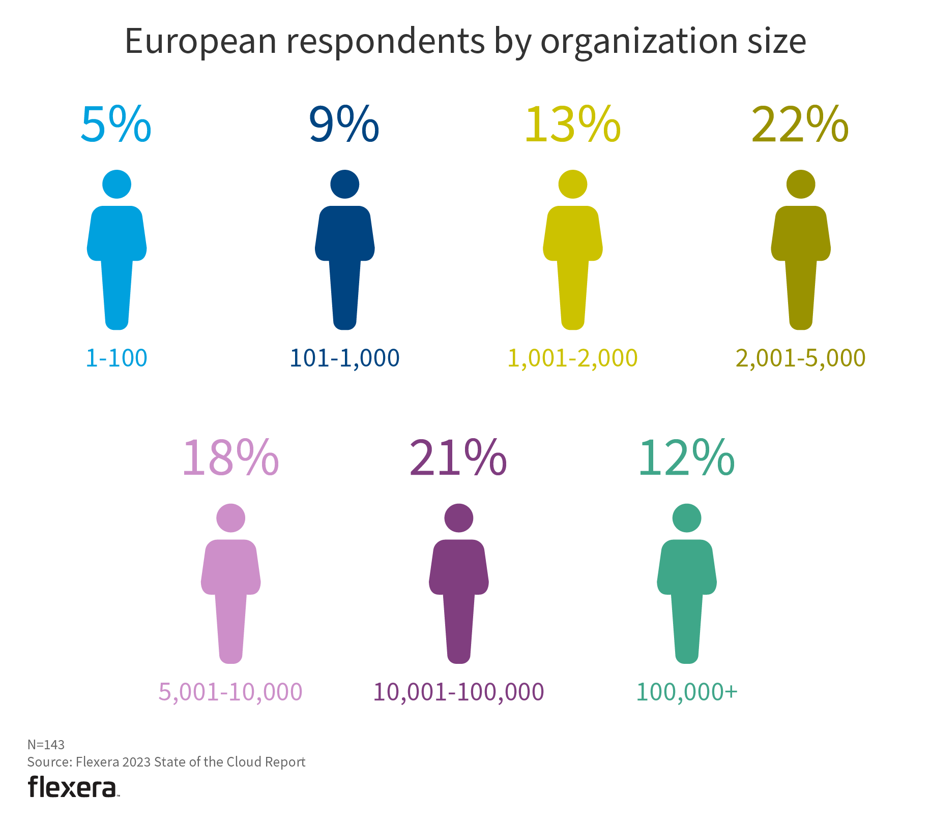 European distribution is very similar to that of the global respondent pool, with 33% coming from organizations of 10,000+ (compared to 32% globally).