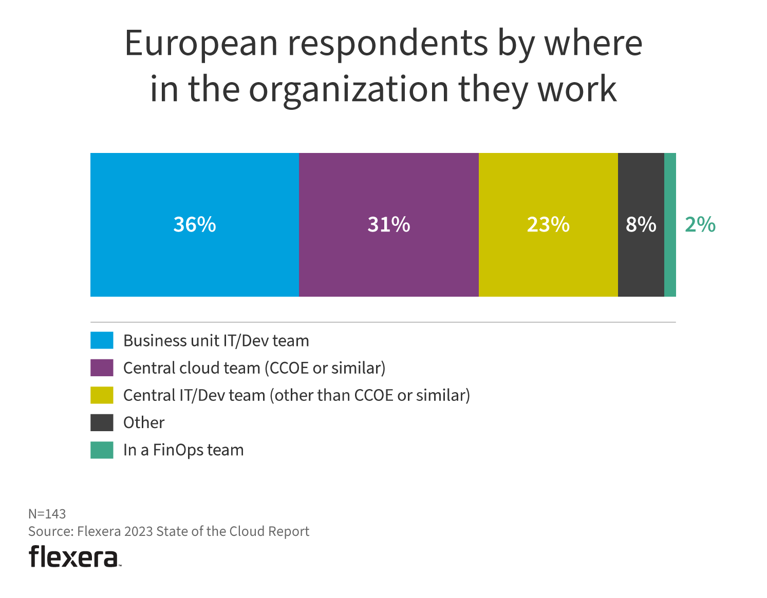 European respondents have similar numbers working in a CCOE, but very few working in FinOps teams (2% vs. 9% globally).