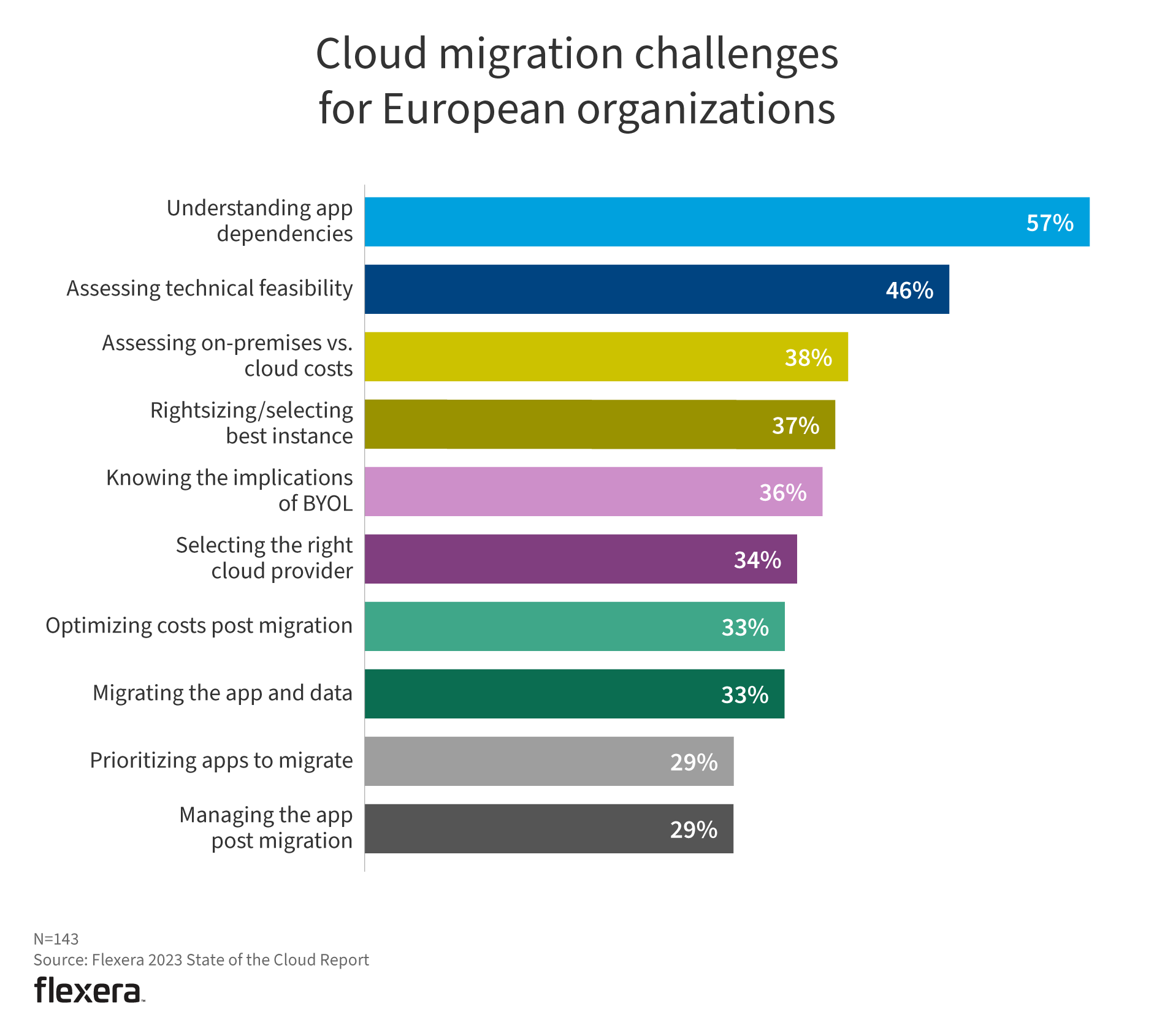 Understanding app dependencies is the top challenge in Europe (57% vs. 49% globally). Rightsizing/selecting best instance is slightly less of an obstacle (37% vs. 42% globally). Other categories remain relatively consistent regardless of geography.