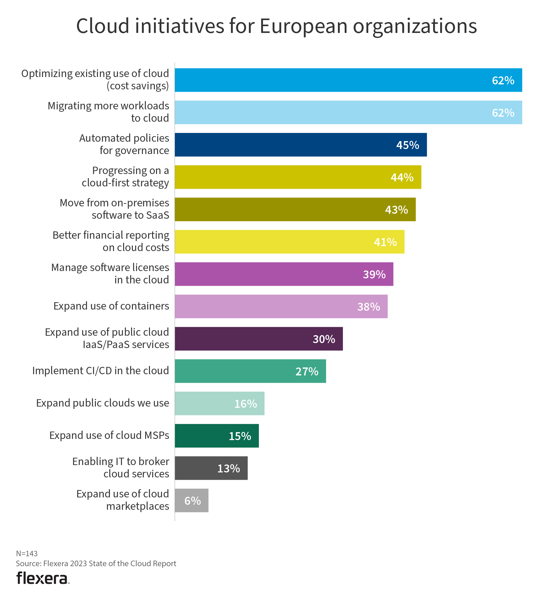 The top initiative in Europe is optimizing existing use of cloud (cost savings). Migrating more workloads to cloud was more of a challenge for European respondents (62% vs. 44% globally), while progressing on a cloud-first strategy ranked lower than the global figure (44% vs. 55%, respectively).