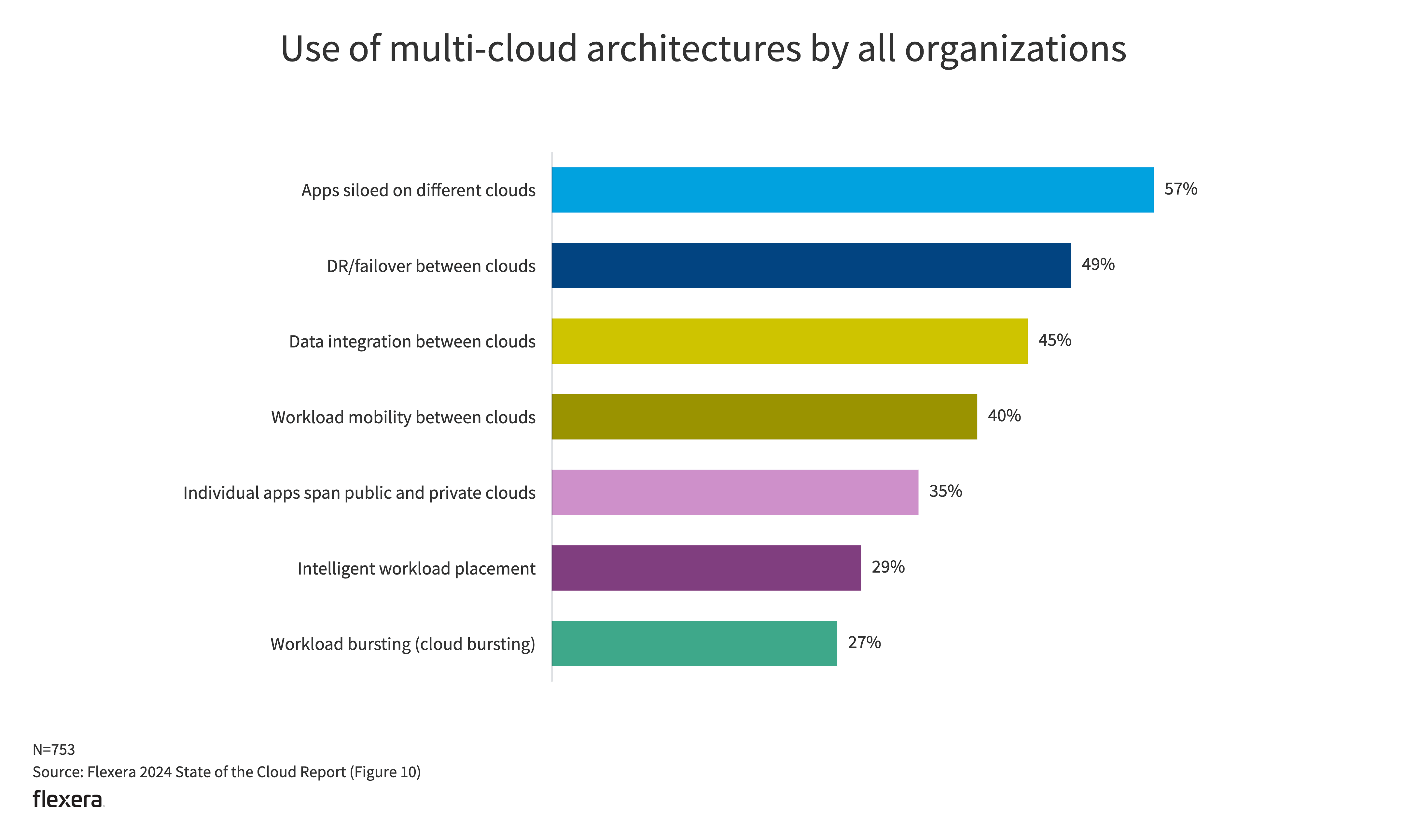 Apps siloed on different clouds and DR/failover between clouds remain the top two multi-cloud implementations. Apps siloed on different clouds increased the most (up to 57% from 44% YoY). Data integration between clouds increased to 45% from 37% YoY as organizations look for the best fit for applications and data analysis.