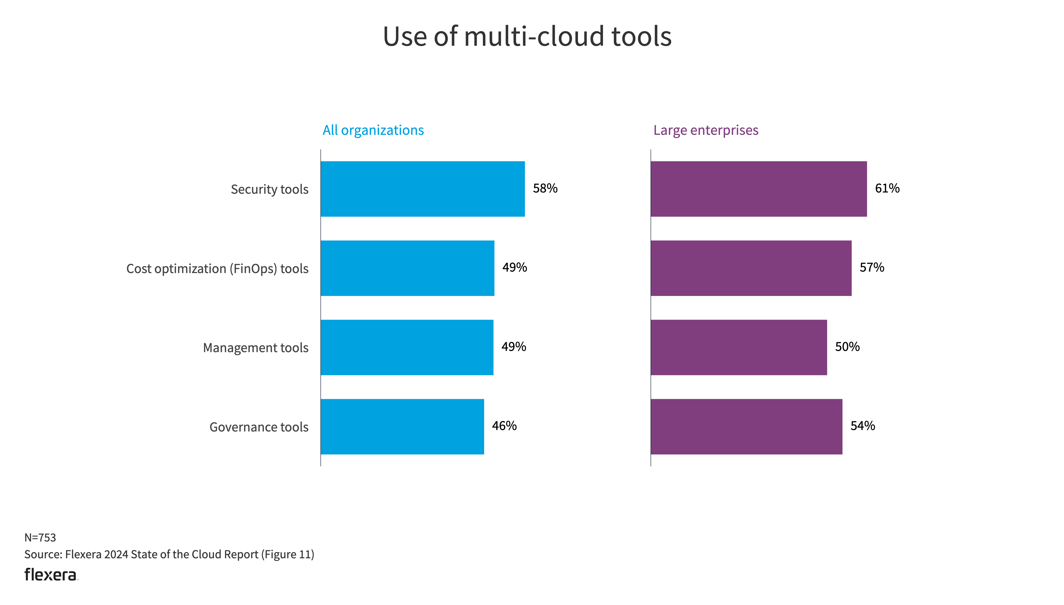 Security tools remain in the top spot this year for all organizations, followed closely by cost optimization (FinOps) tools and management tools. A higher percentage of large enterprises use security tools (61%) and FinOps tools (57%).