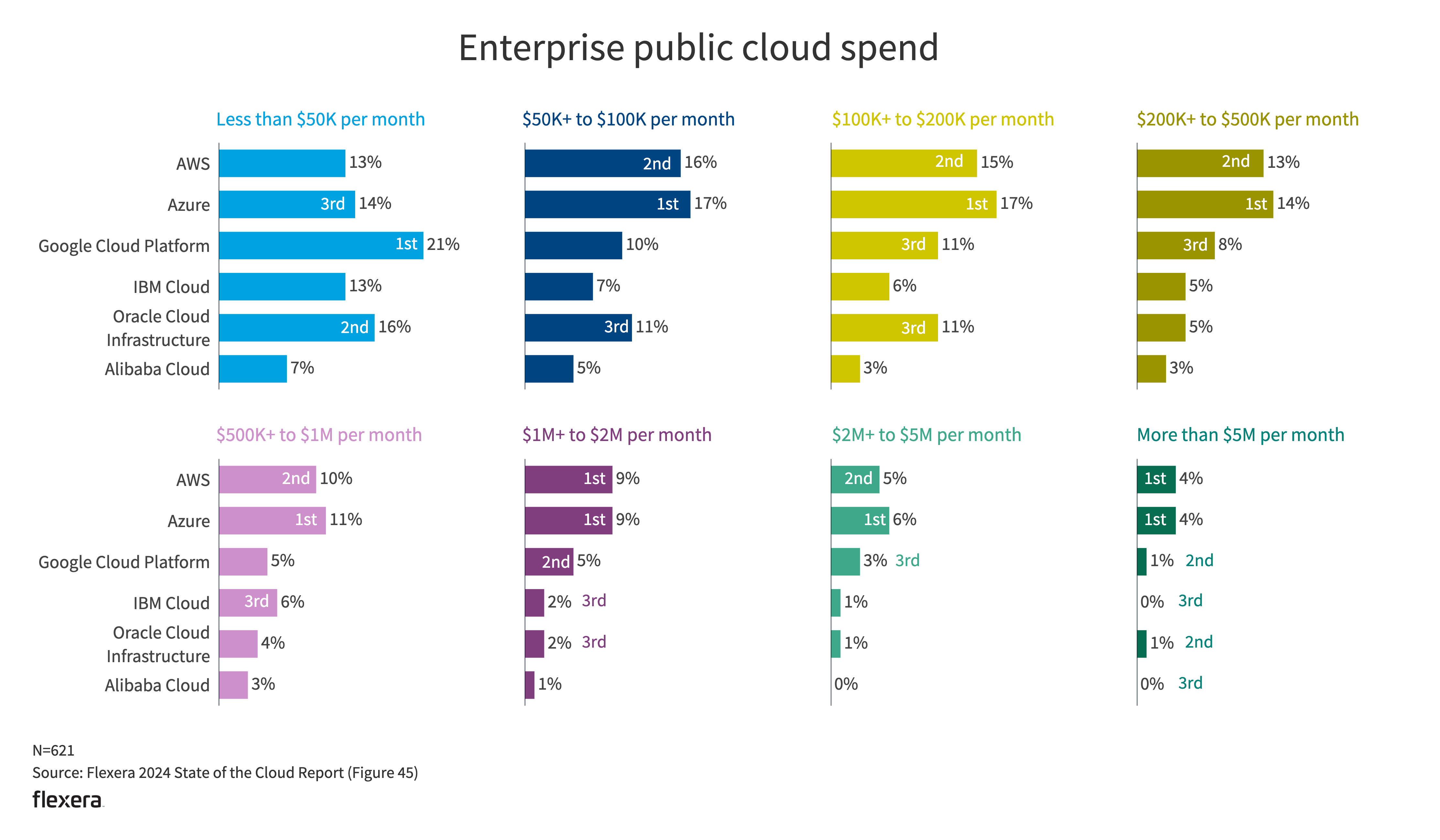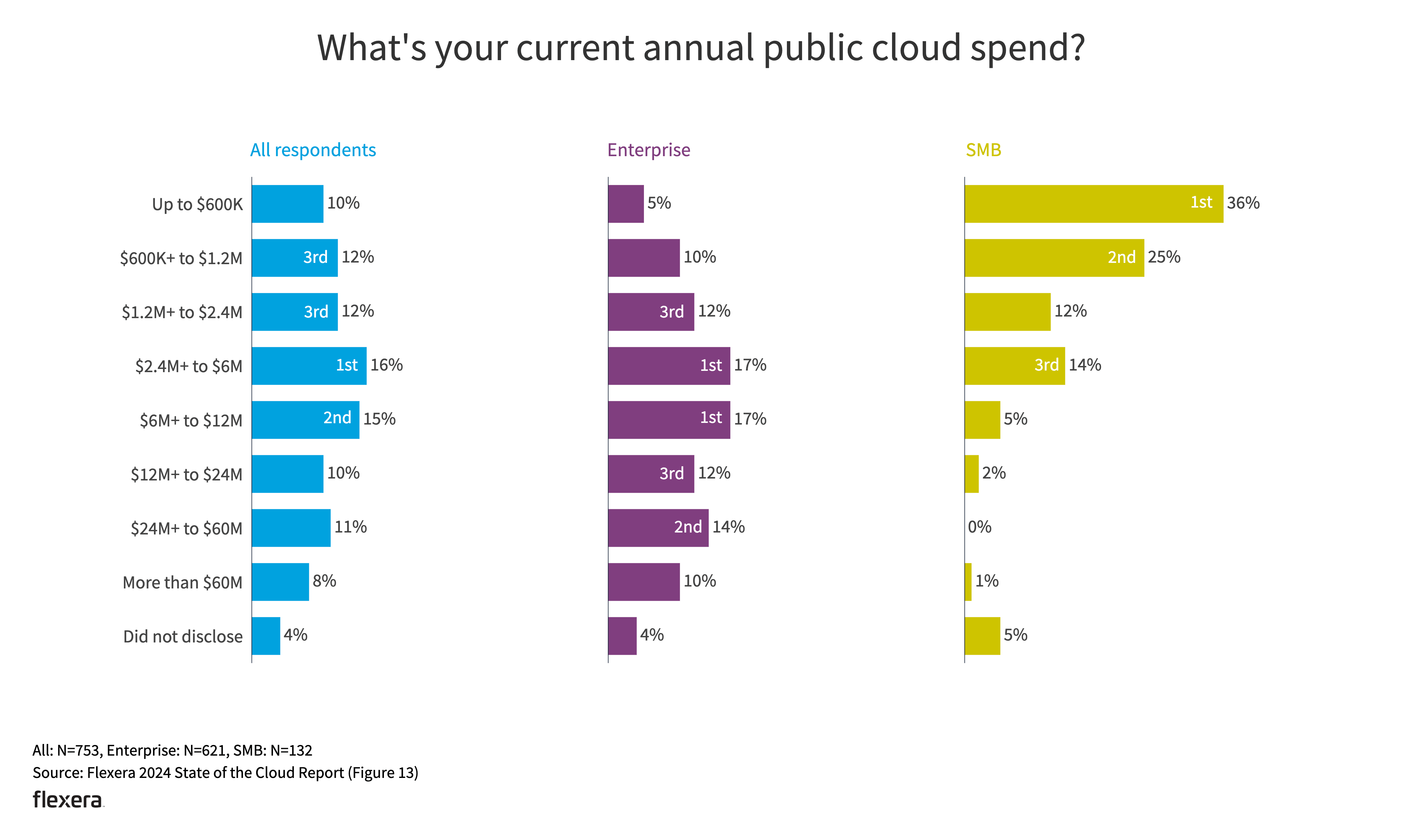 Nearly a third of all respondents (29%) are currently spending more than $12 million a year in public cloud, up from 24% in 2023. Thirty-six percent of enterprises spent more than $12 million a year, up from 29% last year.