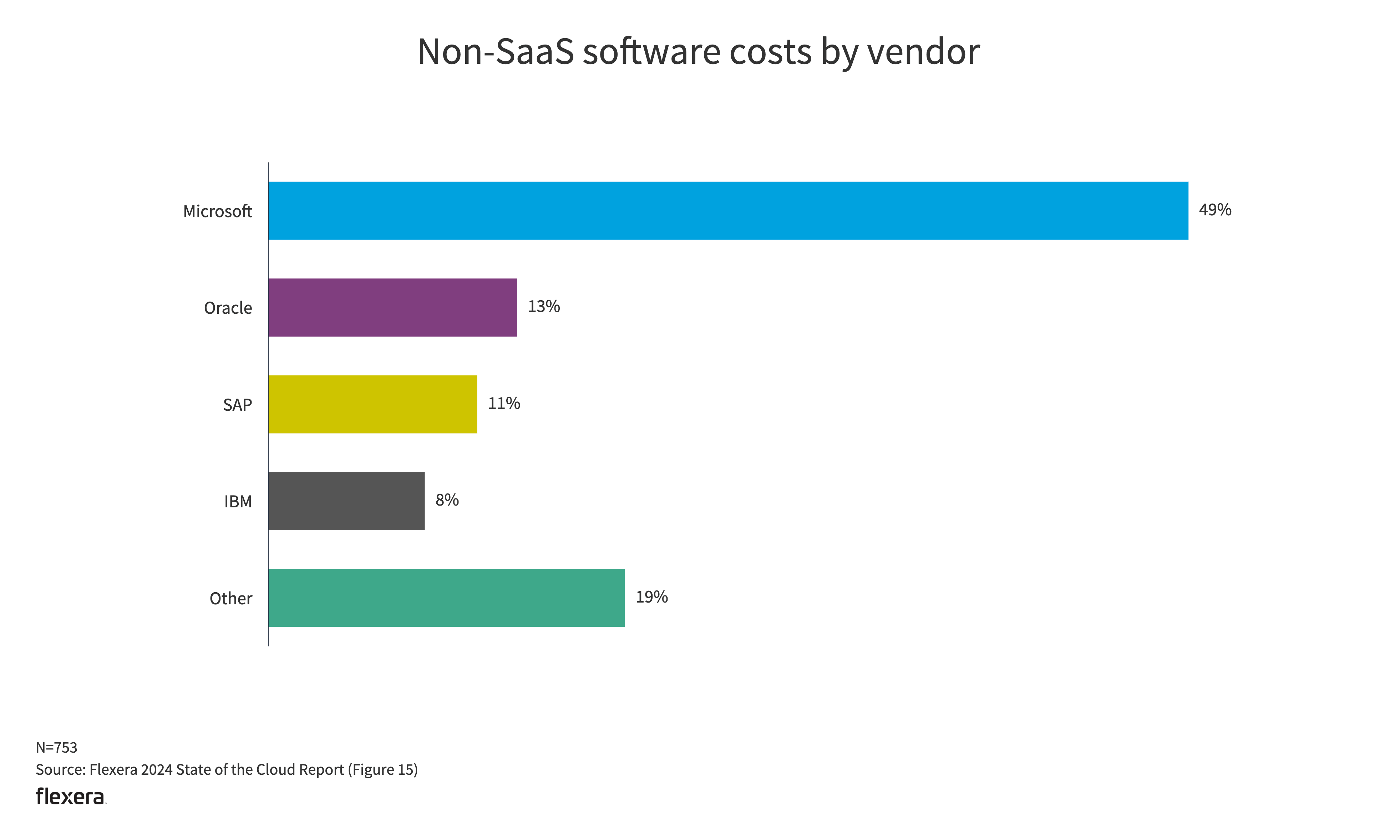 For the first time, Flexera asked respondents for non-SaaS (cloud and on-premises) software costs by vendor. Microsoft is by far the most common non-SaaS software vendor (49%).