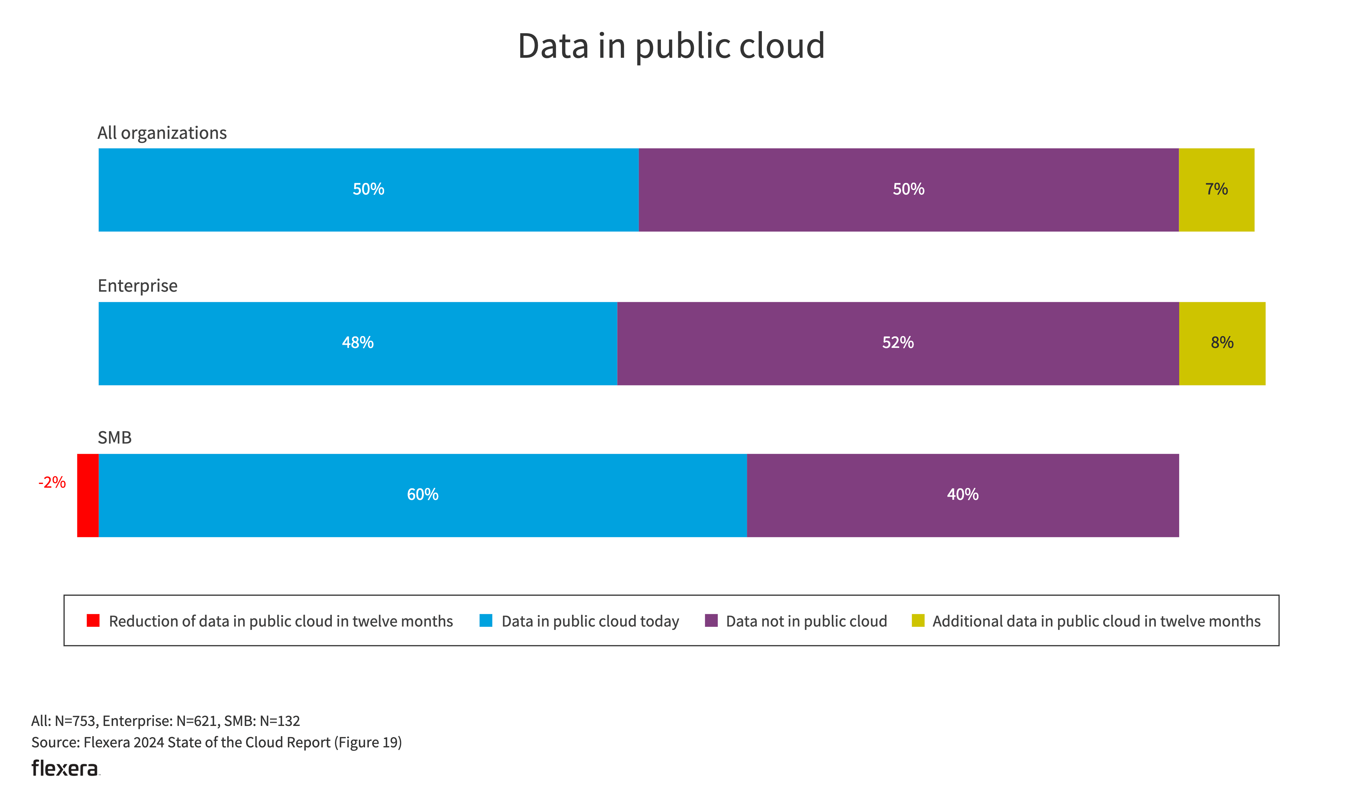 SMBs are the highest cloud adopters but fell off slightly from the previous year, with 61% (a drop from 67% last year) of workloads and 60% of data in the public cloud for both years.