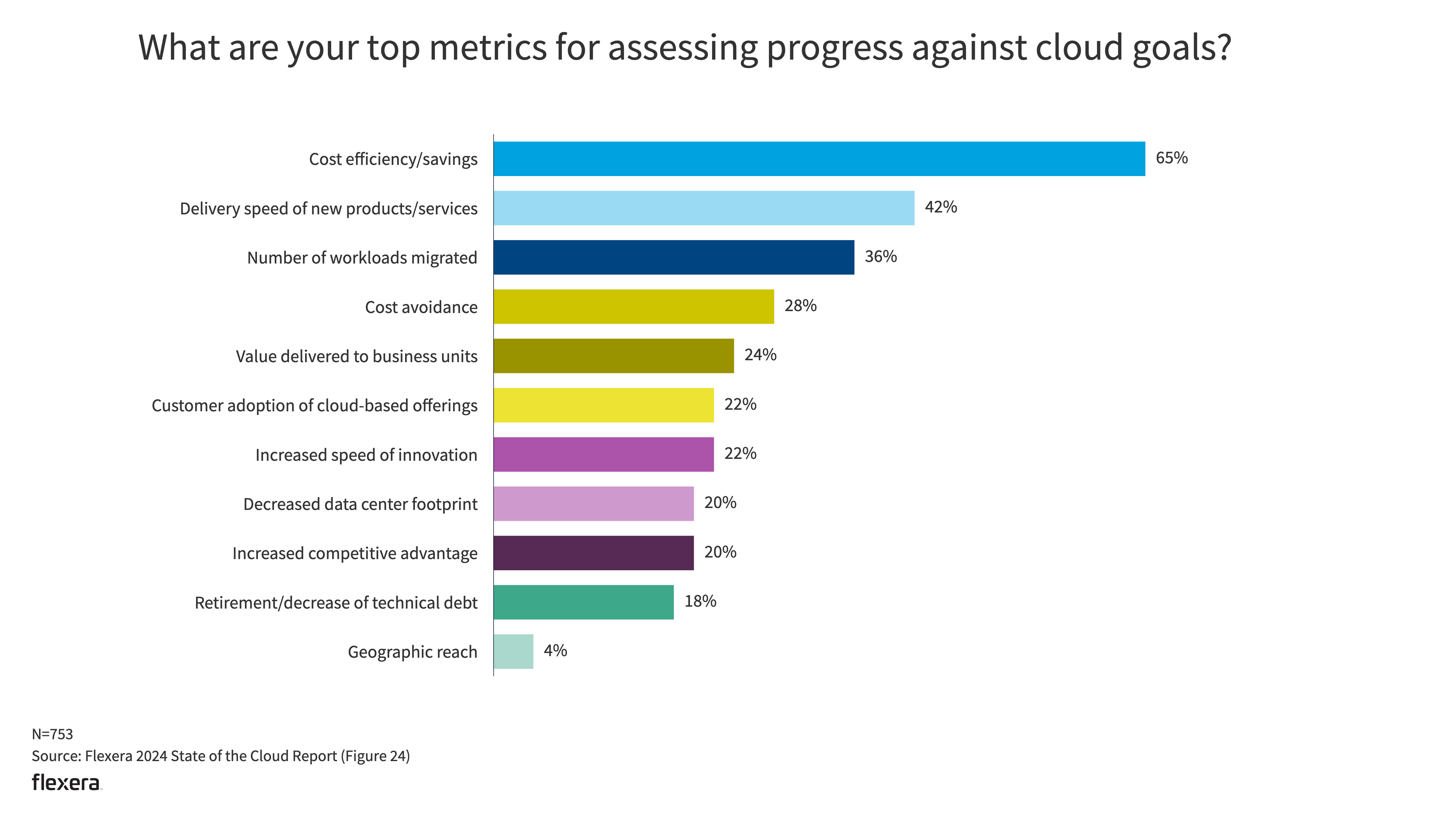The top metric for measuring progress in the cloud has been cost efficiency/savings for the past six years. This year, it has increased to 65% from 60% YoY. The number of workloads migrated to the cloud has also increased YoY from 31% to 36%.