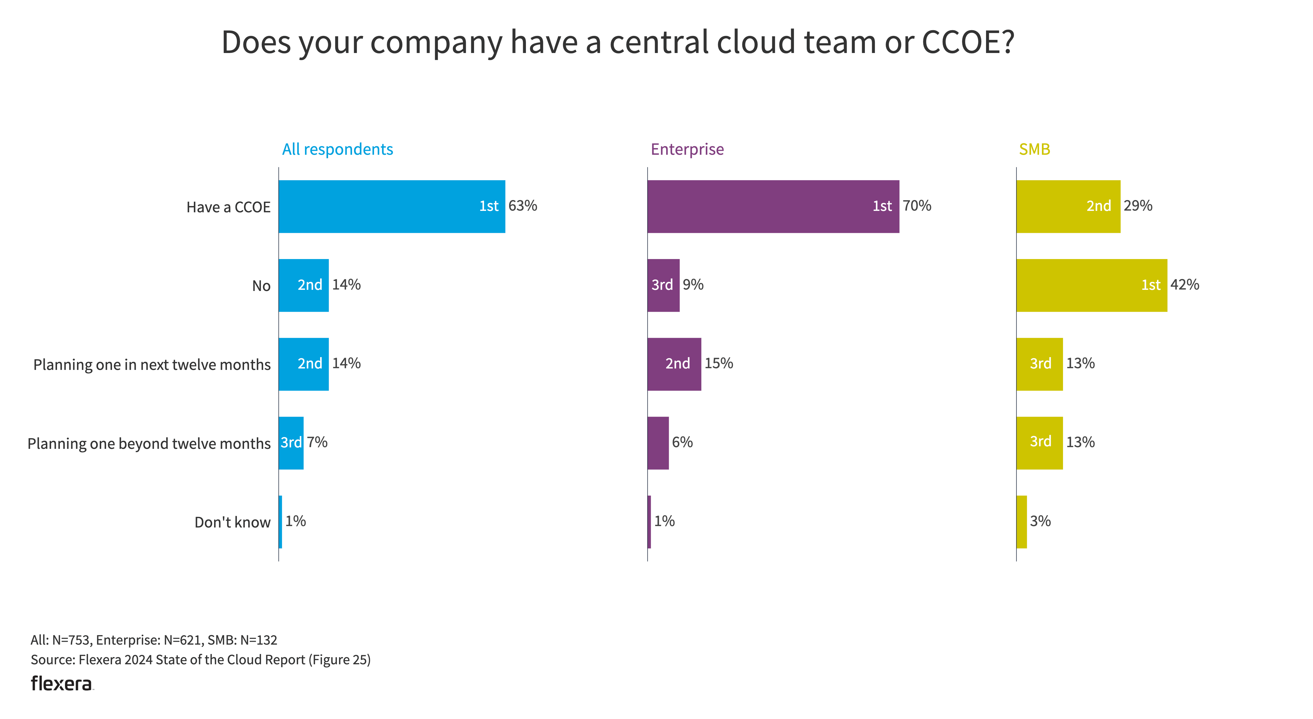 Most organizations (63%) have a CCOE or plan to create one within the next year (14%). Seventy percent of large enterprises already have a CCOE, whereas only 29% of SMBs do. Fifteen percent of enterprises expect to add a CCOE in the next twelve months, and 6% expect to add one beyond that time. Just over a quarter (26%) of SMBs are planning to have a CCOE in the future.