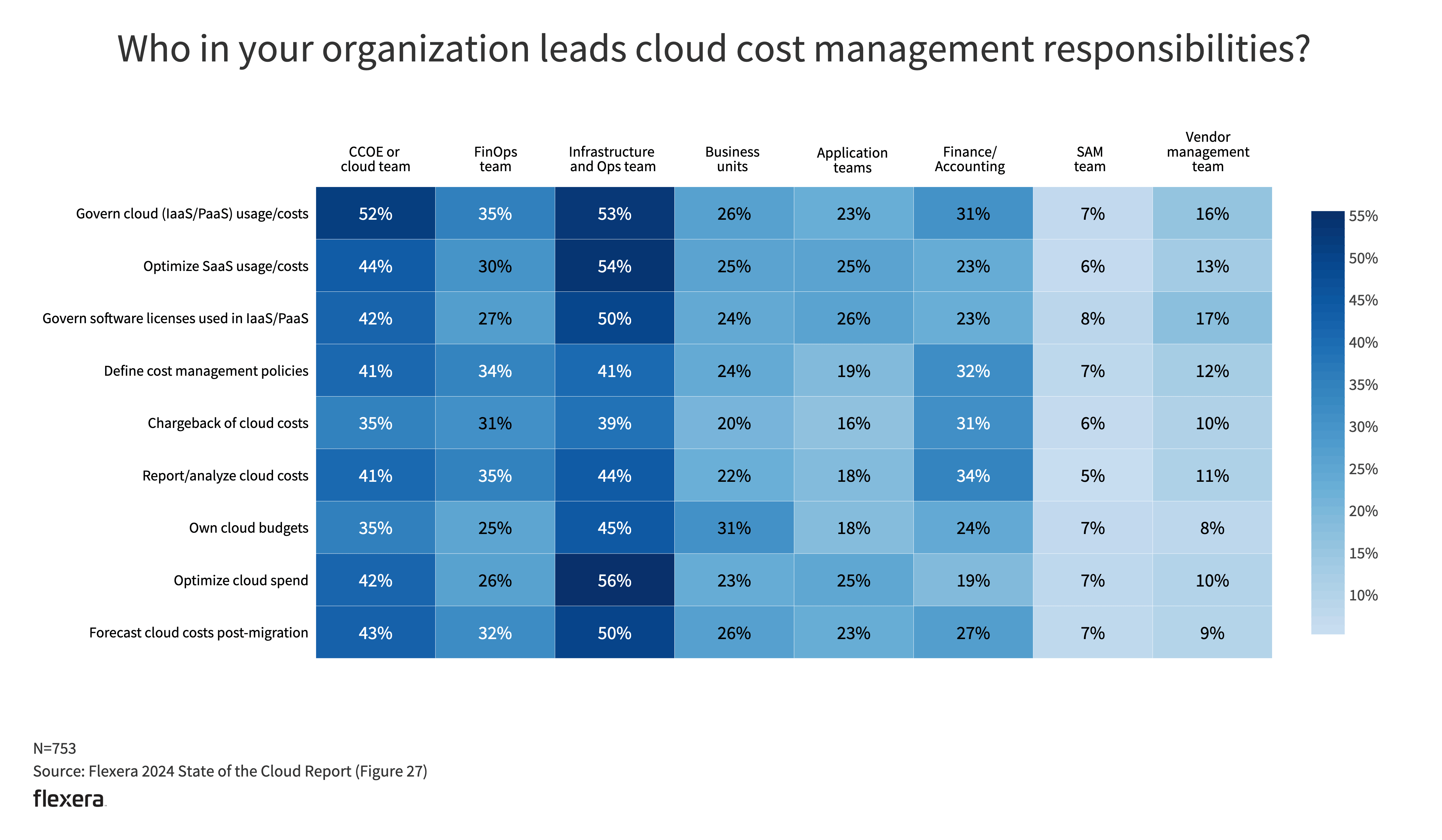 As usual, infrastructure and ops as well as CCOE or cloud teams lead the charge for cloud cost management. Infrastructure and ops teams are most likely to govern cloud (IaaS/PaaS) usage/costs (53%), optimize SaaS usage/costs (54%) and govern software licenses in IaaS/PaaS (50%).