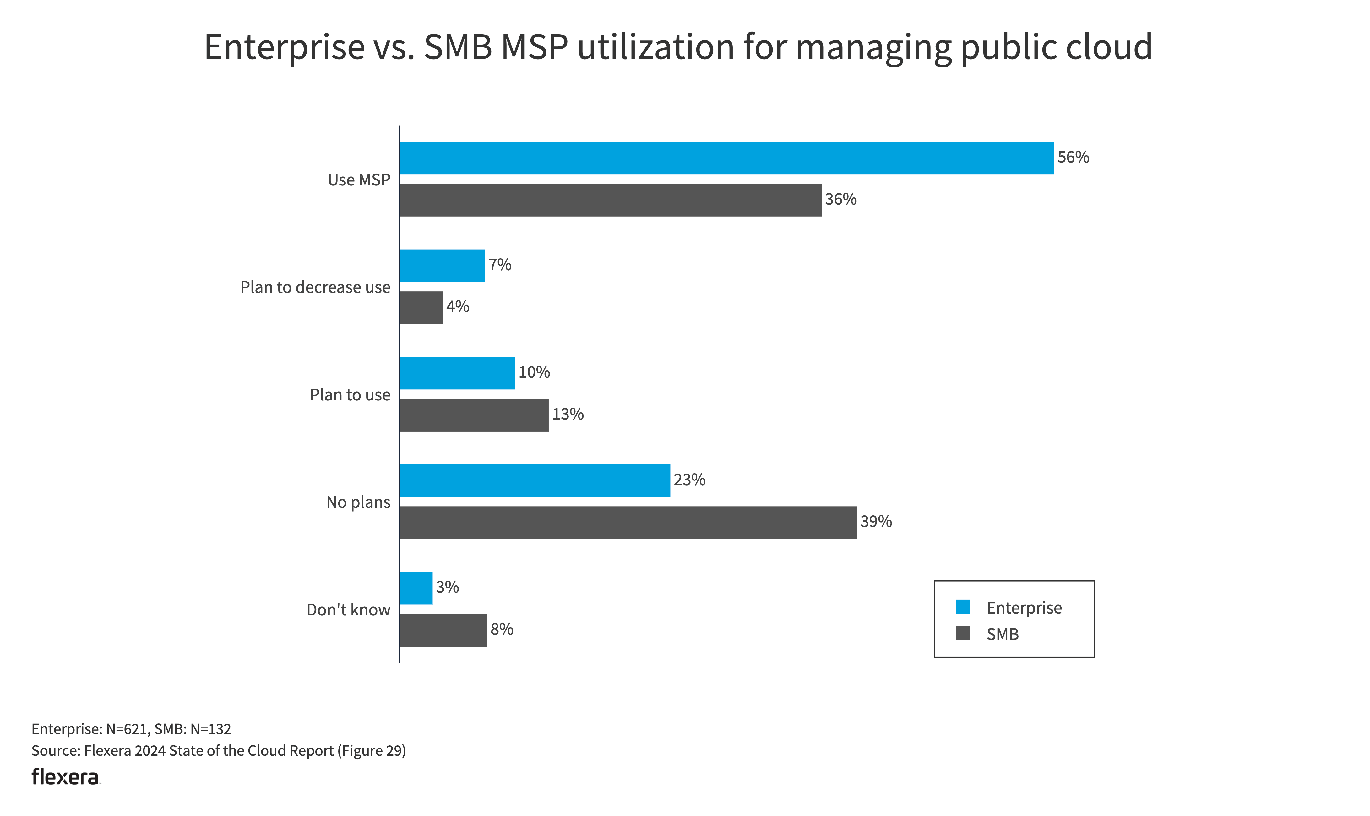 Fifty-six percent of enterprises are outsourcing at least some public cloud work. SMB usage of MSPs has increased to 36% from 26% YoY.