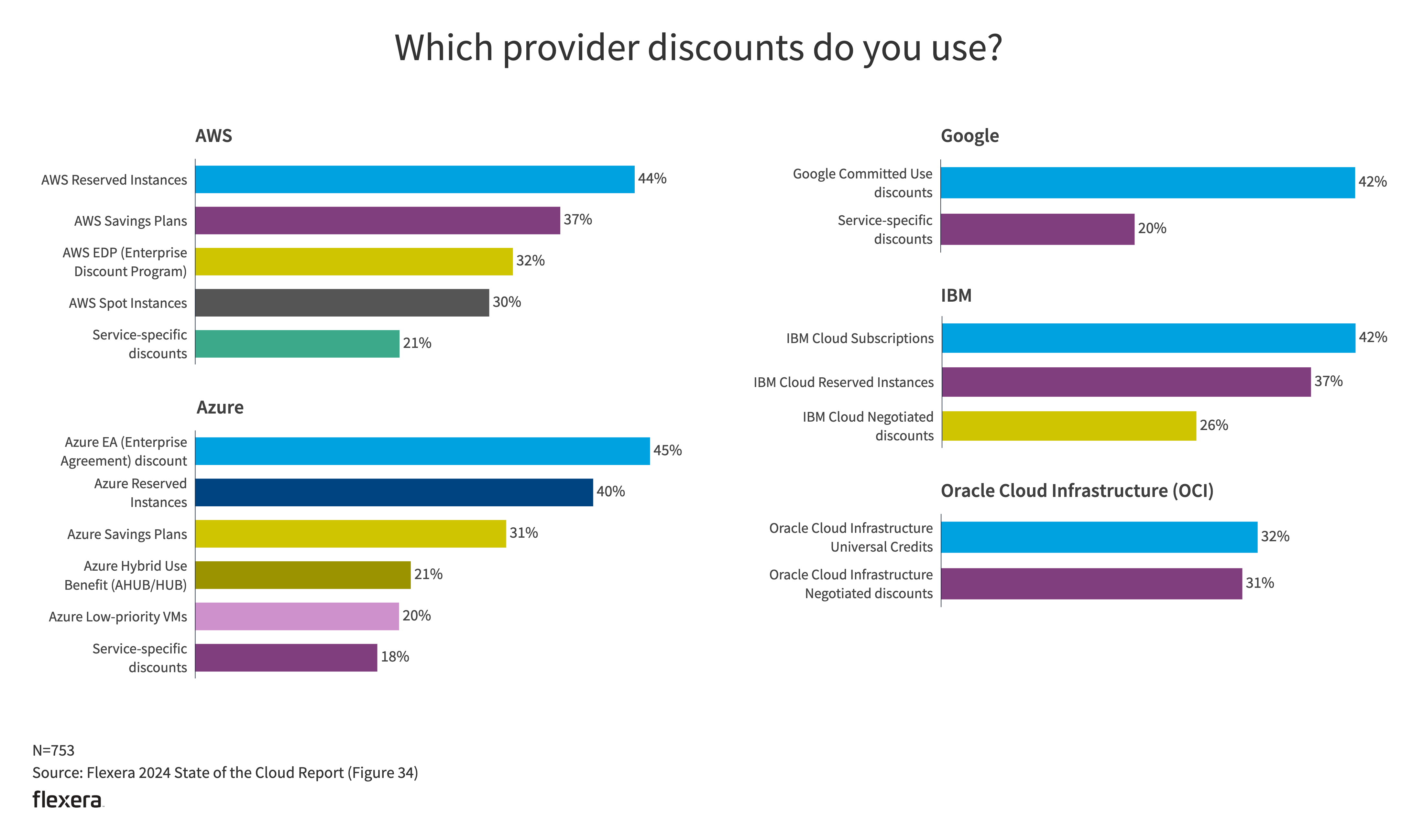 Cloud provider pricing structures are complex and difficult to decipher, but provider discounts offer opportunities to reduce costs. The majority of respondents are using either Azure EA (Enterprise Agreement) discount (45%), AWS Reserved Instances (44%), IBM Cloud Subscriptions (42%), Google Committed Use discount (42%) or Azure Reserved Instances (40%).