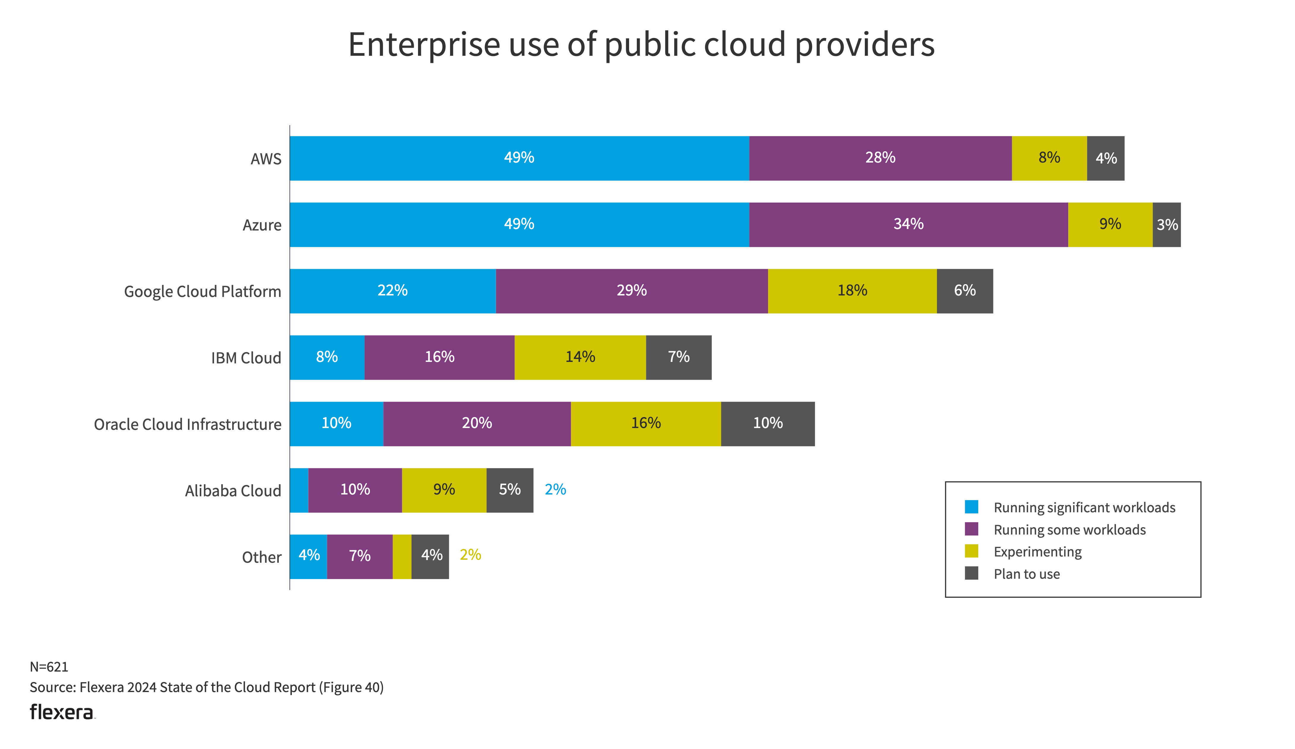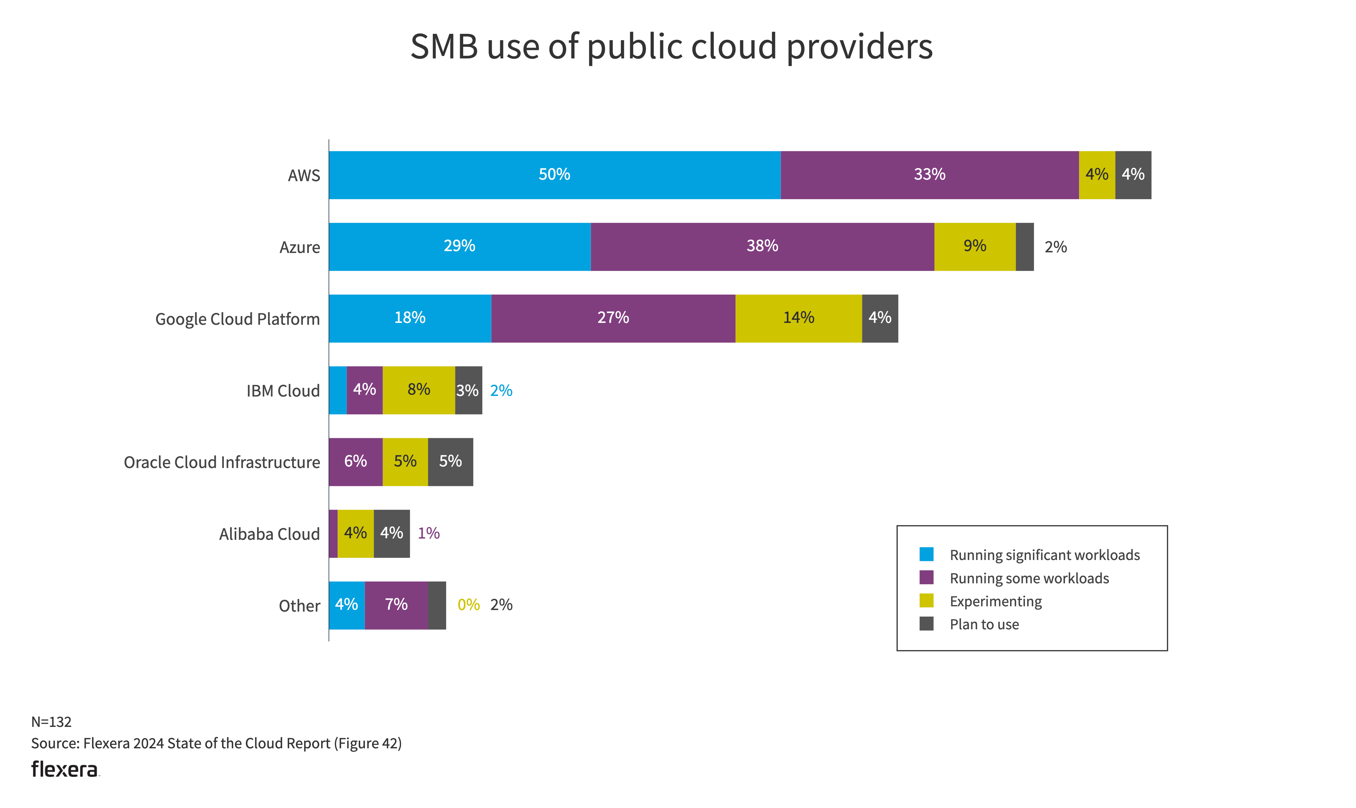 AWS and Azure are tied with 49% of enterprises running significant workloads. However, AWS has a significant lead over other providers with SMBs (50% for AWS, 29% for Azure and 18% for Google Cloud Platform).