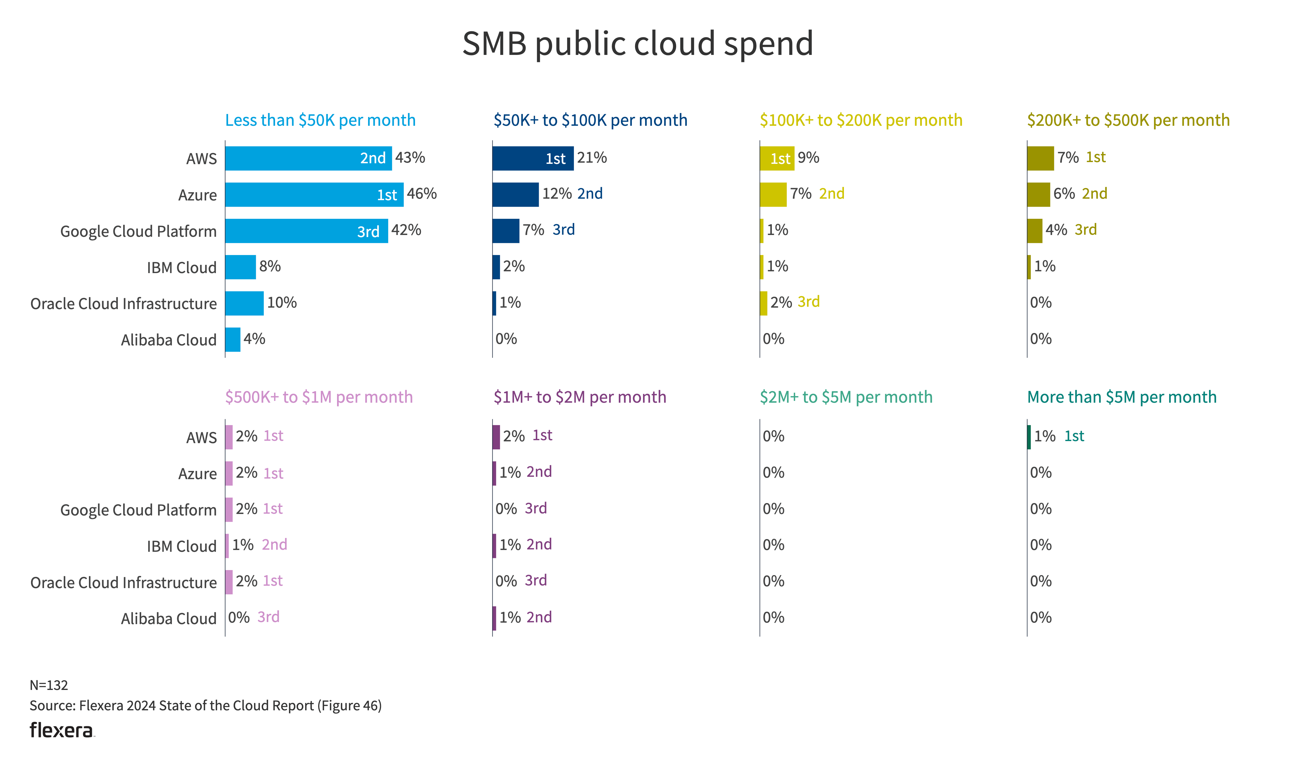 AWS (43%), Azure (46%) and Google Cloud Platform (42%) are near parity with SMBs that spend less than $50,000 on public cloud. For SMBs that spend $50,000 or more on public cloud, AWS holds the lead (42%) over Azure (28%).