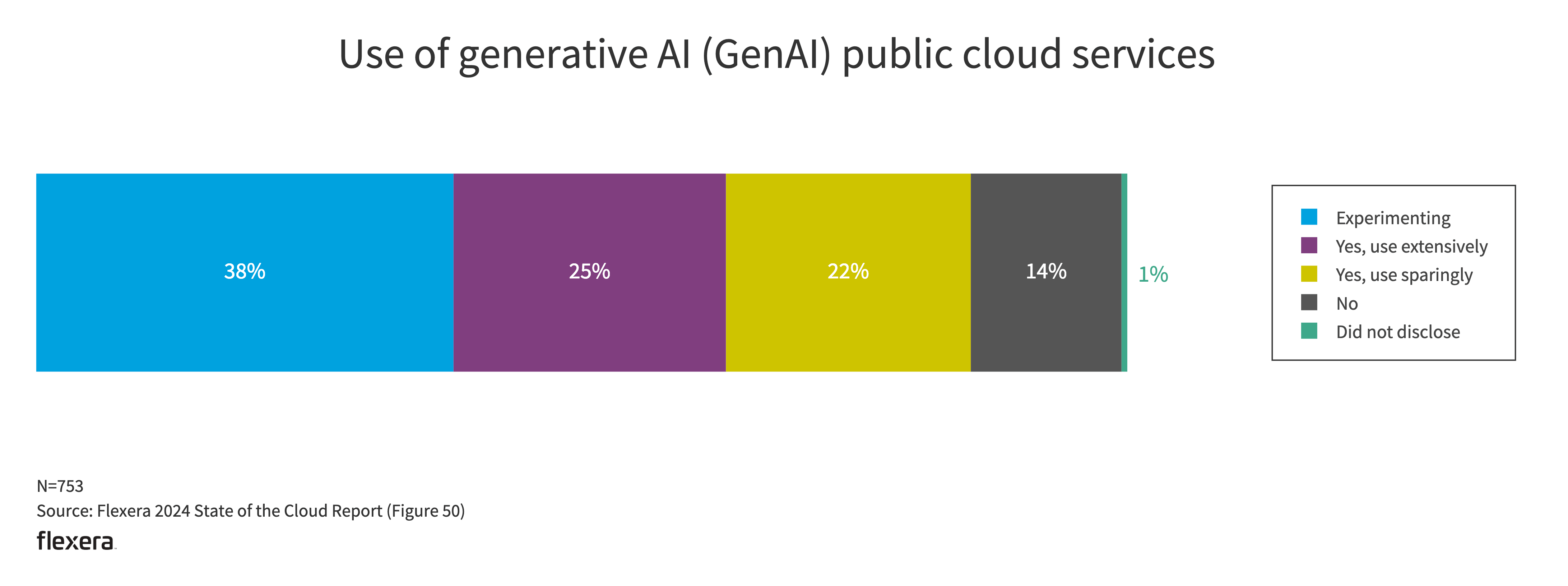 This year, we asked if respondents are using any public cloud provider’s GenAI services. A quarter of respondents say they already use it extensively, 38% are experimenting and 22% use it sparingly.