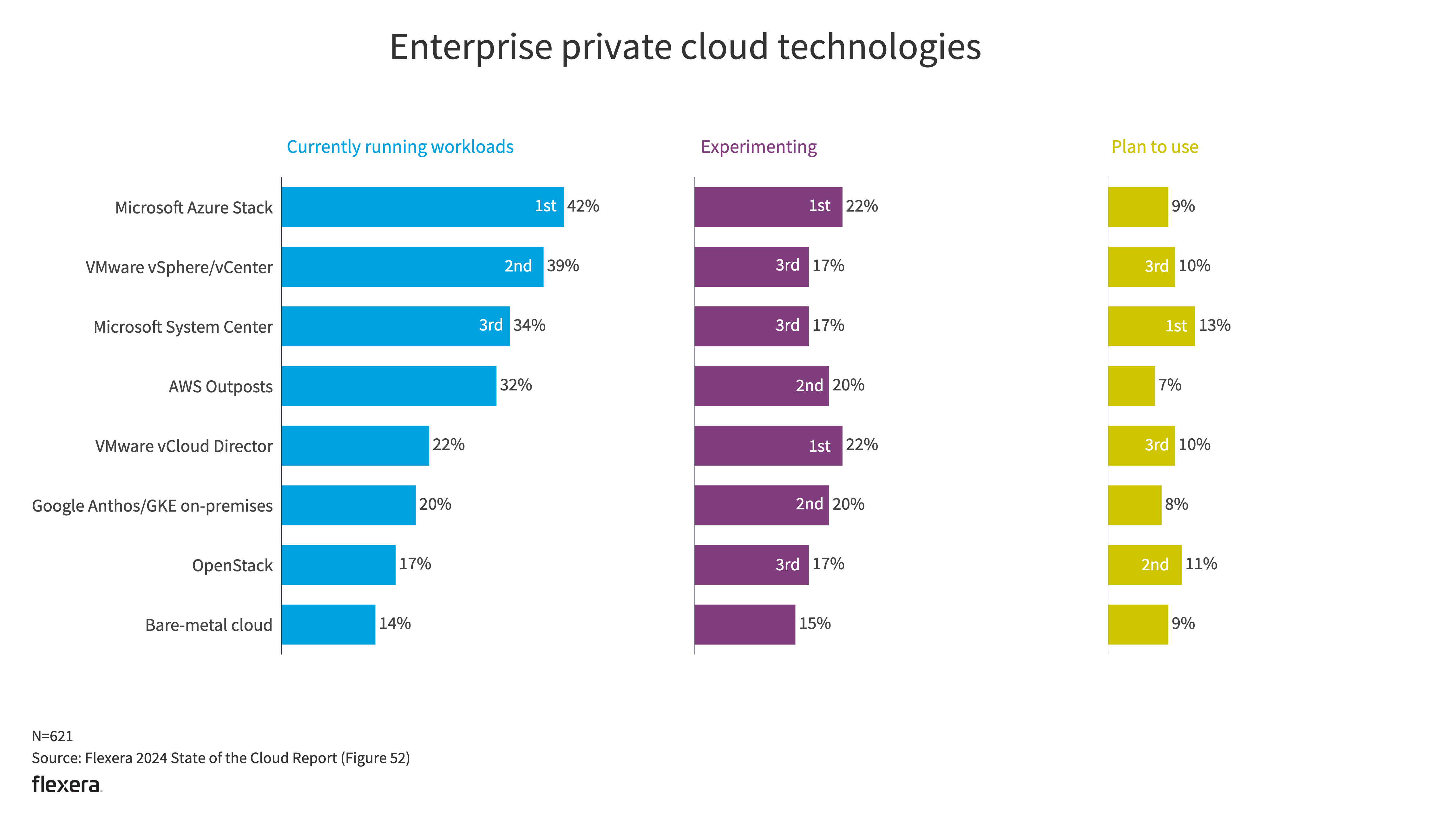 Most organizations are taking a multi-cloud, hybrid approach, in which private cloud plays an essential role. Similar to last year, Microsoft Azure Stack ranks first with 38%. VMware vSphere/vCenter climbed into the second spot with 36%, up from 28% YoY. Usage of all other private cloud technologies has remained relatively flat, with OpenStack and bare-metal cloud usage holding the final two spots as they have in prior years.