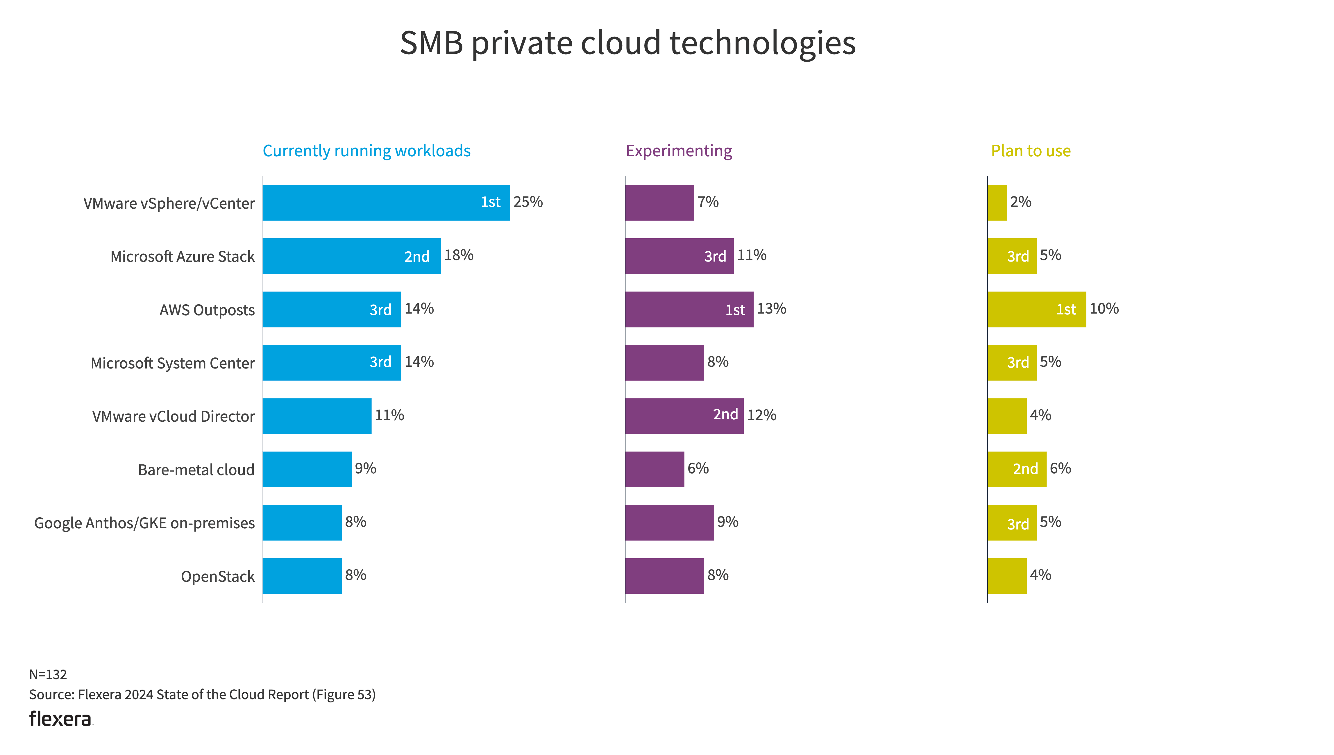 SMBs are less likely to use VMware technologies, possibly due to perceived changes to the channel after the Broadcom acquisition. As the State of the Cloud Report has demonstrated year over year, SMBs are more likely to put workloads in the public cloud—and they are less reliant on private cloud technologies.