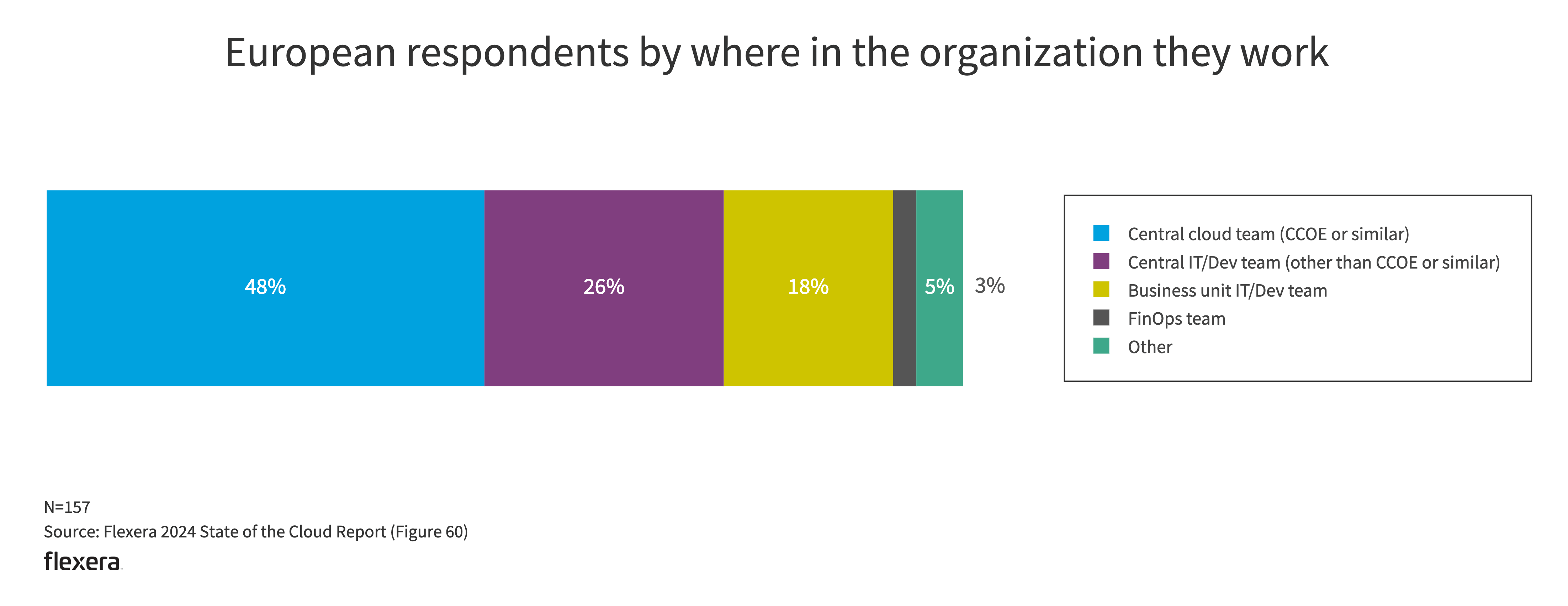European respondents have more respondents working in a central IT/dev team (26% European vs. 20% globally) but have very few working in FinOps teams (3% vs. 7% globally).