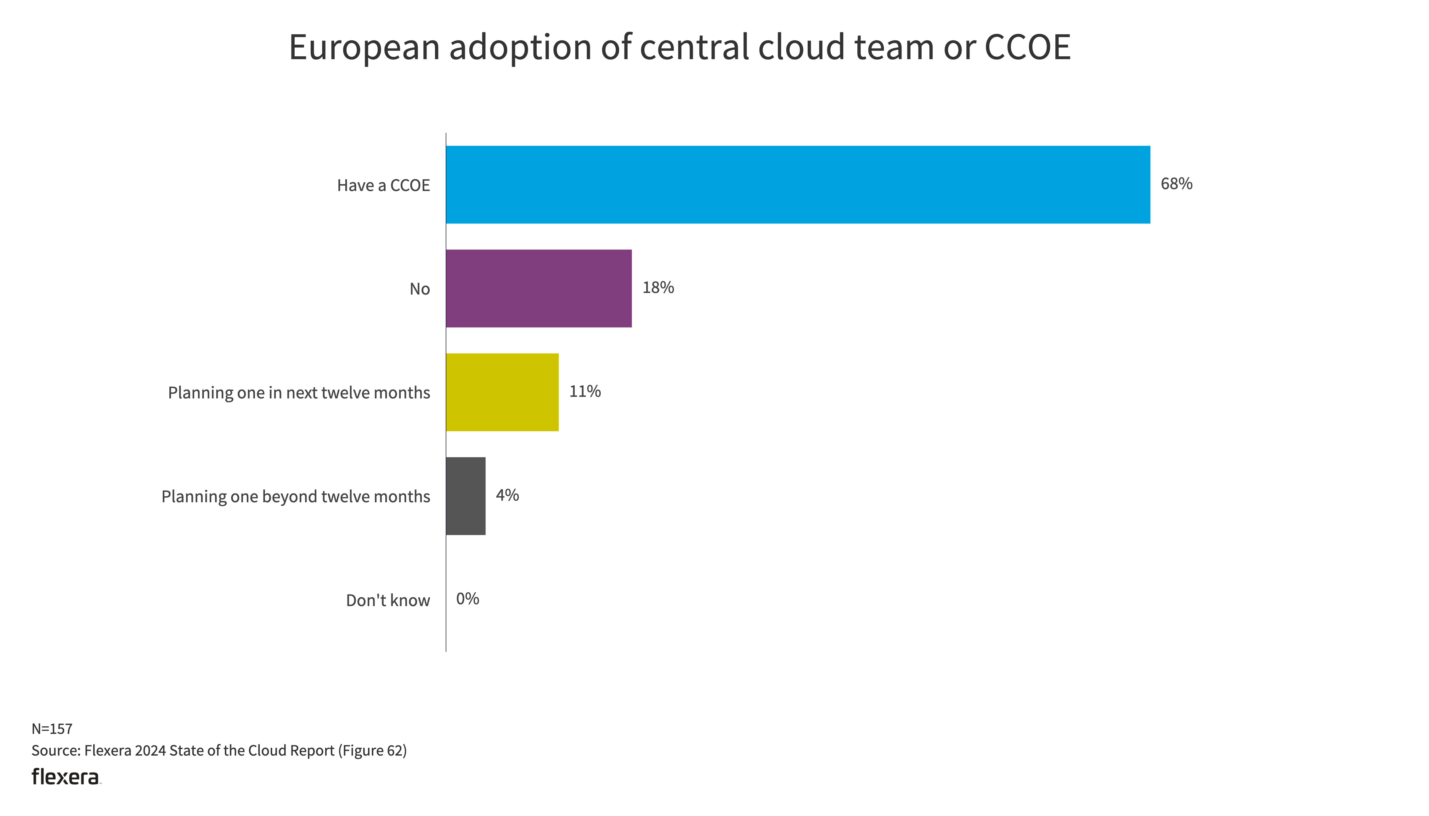 European respondents have similar numbers working in a central cloud team or CCOE. Over two-thirds (68%) have a CCOE currently, and another 11% plan to have one in the next year.