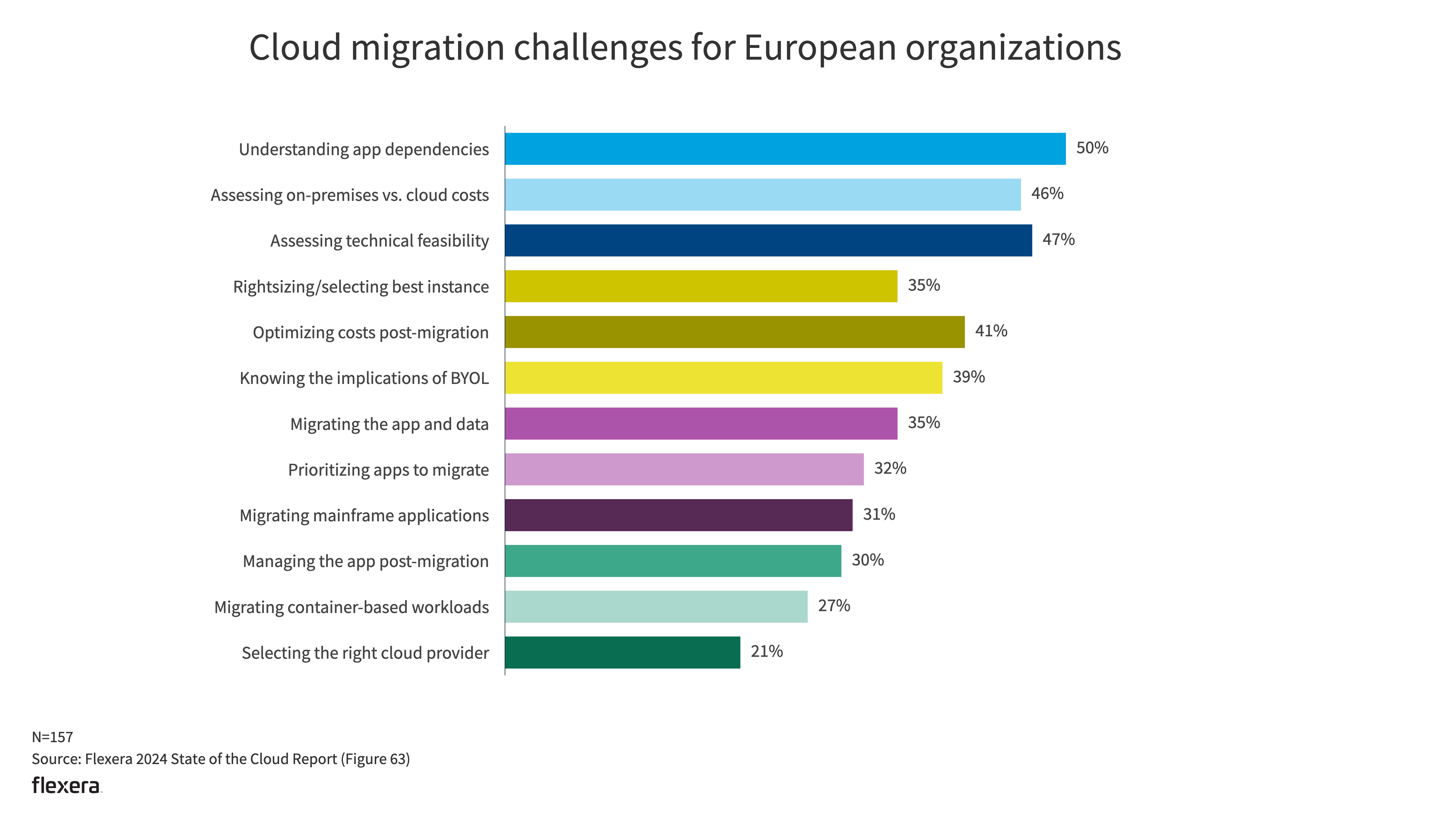 Challenges in Europe are similar to those revealed in the global results. Understanding app dependencies (50%) is the top challenge in Europe, followed by assessing technical feasibility (47%) and assessing on-premises vs. cloud costs (46%).