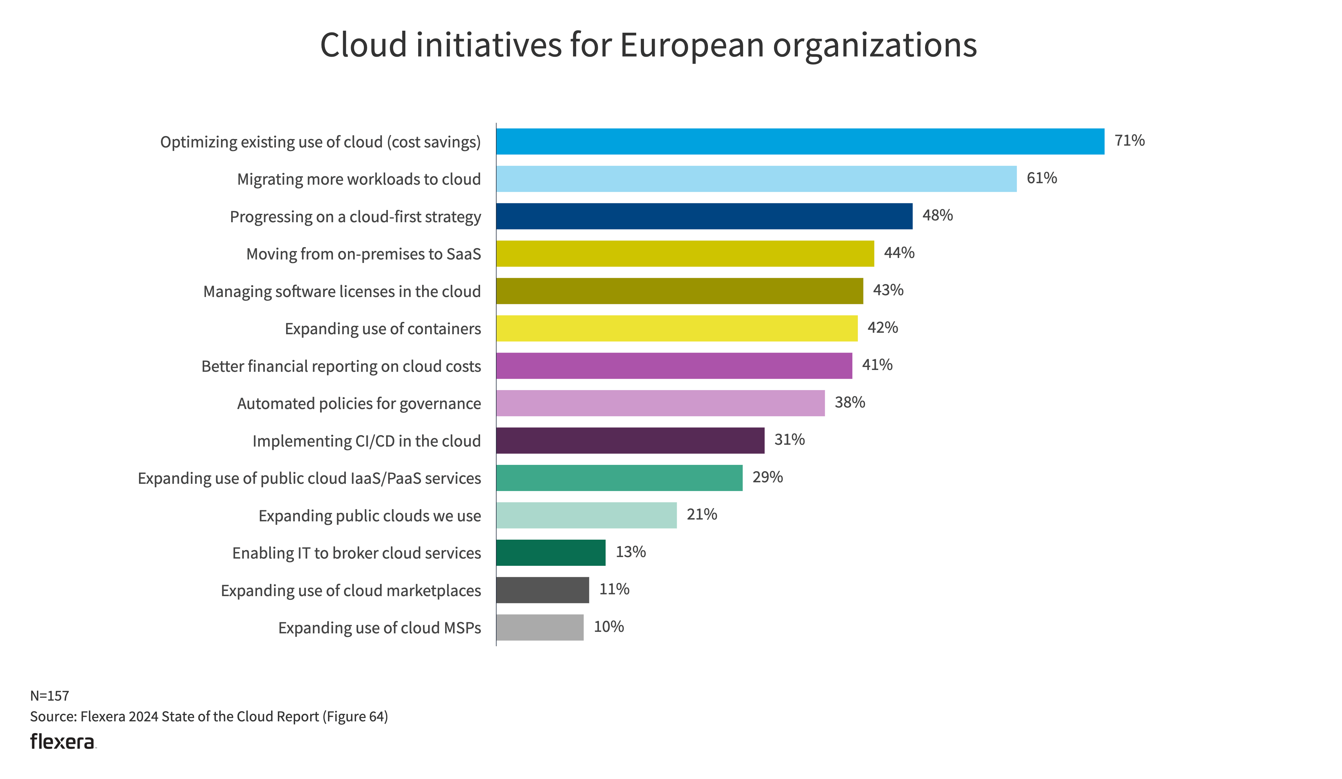 This is the eighth year in a row that optimizing the existing use of cloud (cost savings) is the top initiative (increasing from 62% to 71% YoY). Notably, progressing on a cloud-first strategy dropped to 48% from 55% YoY. Migrating more workloads to cloud increased from 44% to 58% YoY. A high percentage of heavy cloud users (73%) see optimizing the existing use of the cloud (cost savings) as a top initiative.