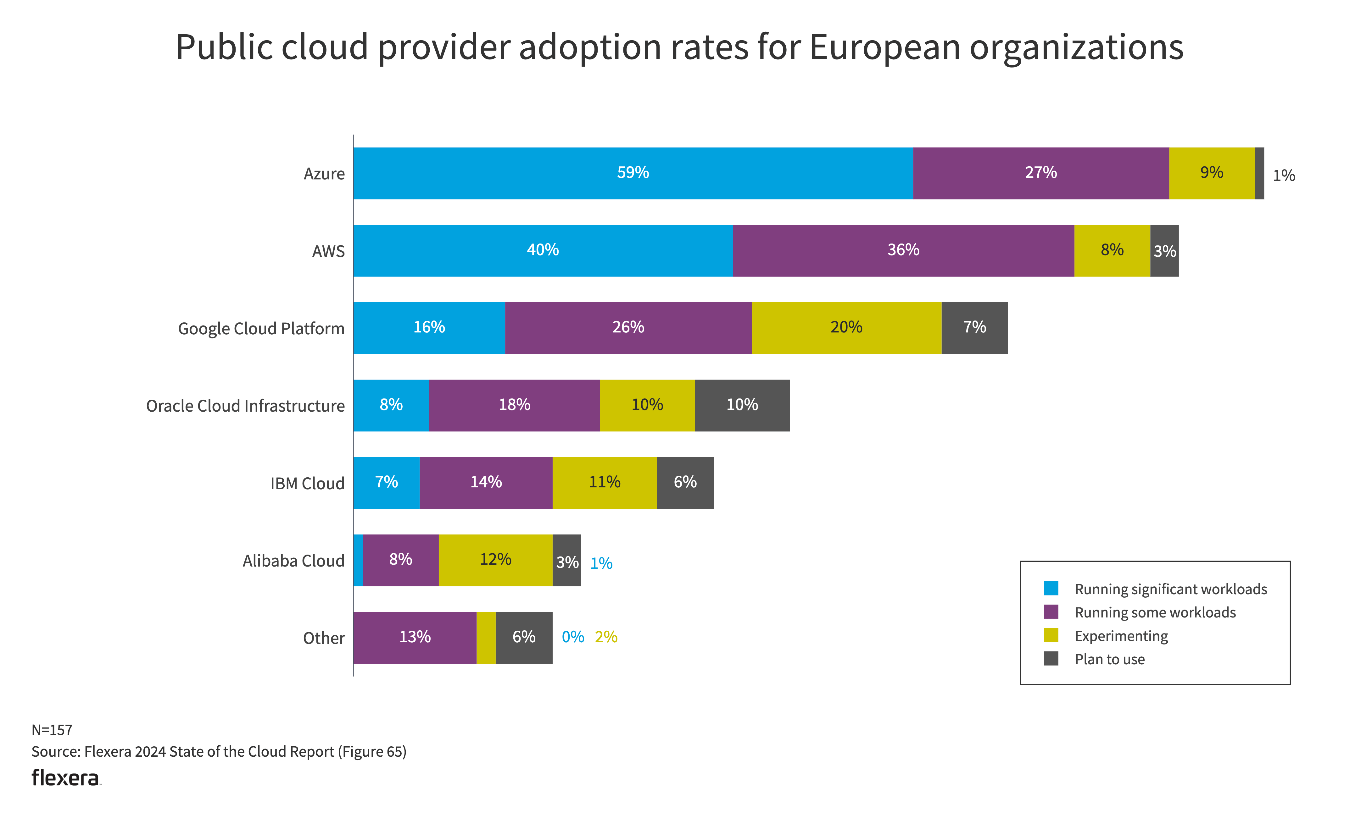 European respondents show a distinct trend in cloud adoption compared to the global average, with a lower proportion using AWS and a higher inclination toward Azure. While 40% of European respondents have significant workloads in AWS, this is lower than the nearly half (49%) seen in the global respondent pool. On the other hand, Azure sees greater usage in Europe, with 59% of European respondents running significant workloads on Azure, a notable 14% increase over the global figure of 45%.