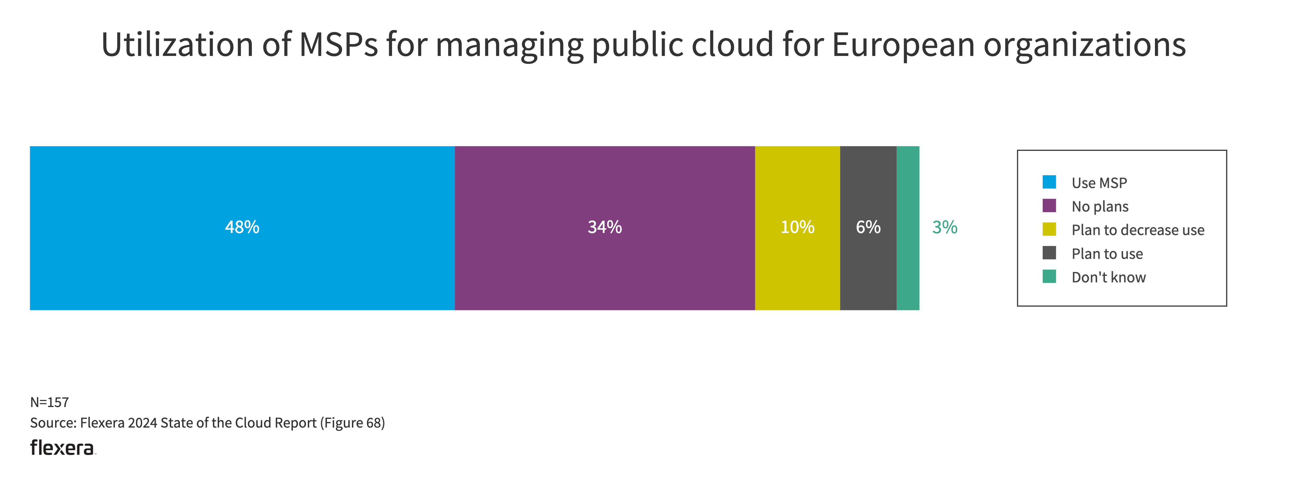 European respondents are less likely (48% vs. 53% globally) to use an MSP for managing at least some of their cloud usage. They are also less likely (6% vs. 10% globally) to plan to use an MSP in the future.