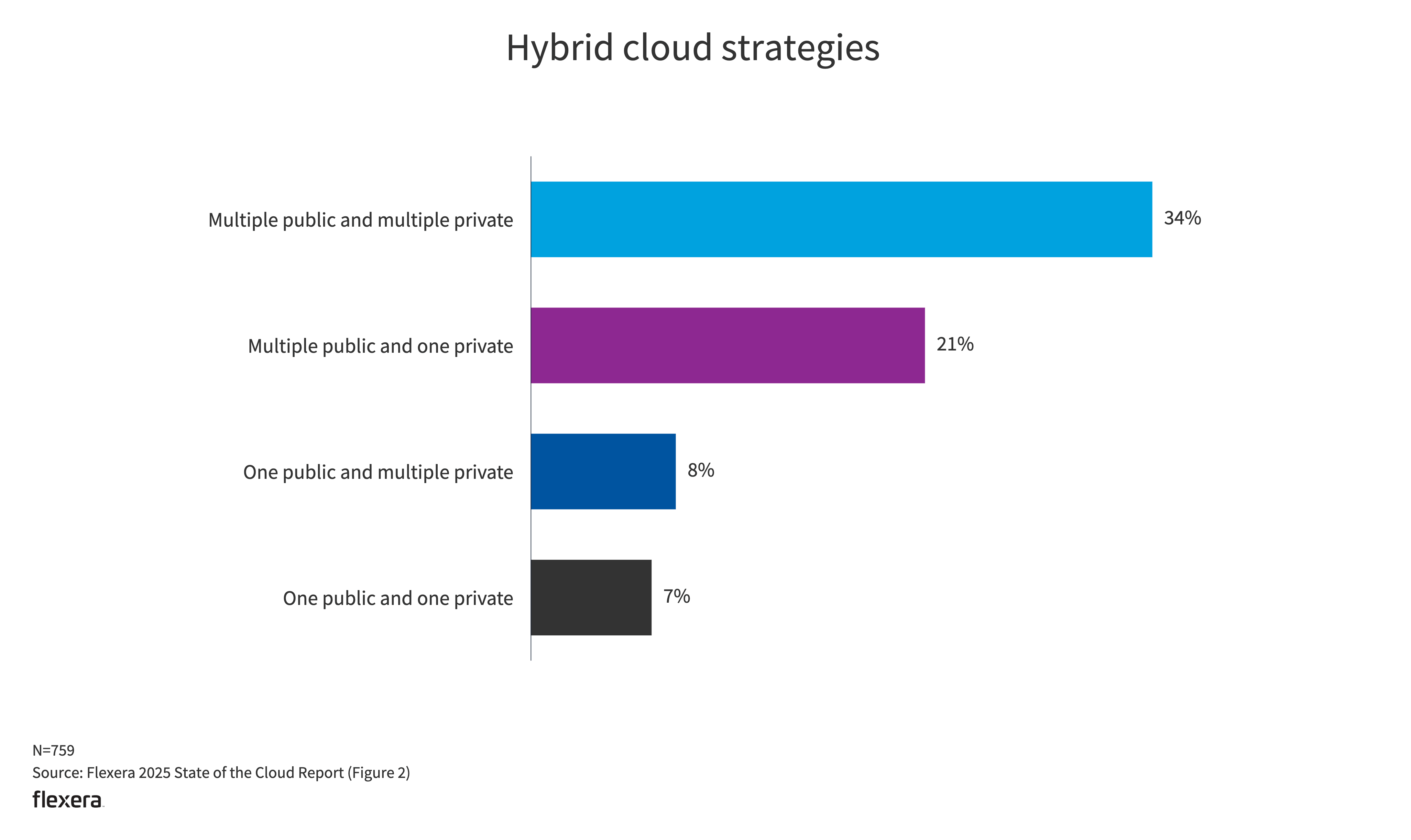 Organizations seem to have found their steady state—70% of respondents embrace hybrid cloud strategies, using at least one public and one private cloud