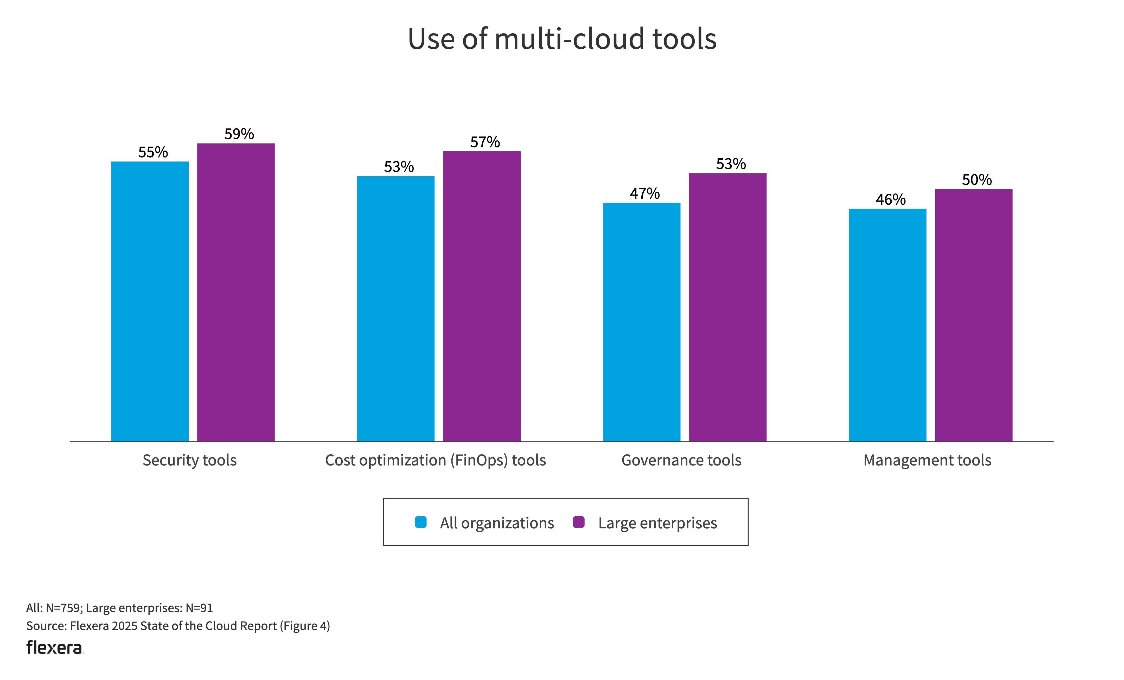 This new normal is also reflected when asking about which clouds organizations choose to use. Looking at multi-cloud strategies, 70% of respondents embrace hybrid cloud strategies, using at least one public and one private cloud, while the remaining 30% use only public cloud(s) or private cloud(s). Large enterprises make use of multi-cloud tools more than do smaller organizations, regardless of the tool type. Security tools see the greatest use in large enterprises (59%), which is an ongoing trend.