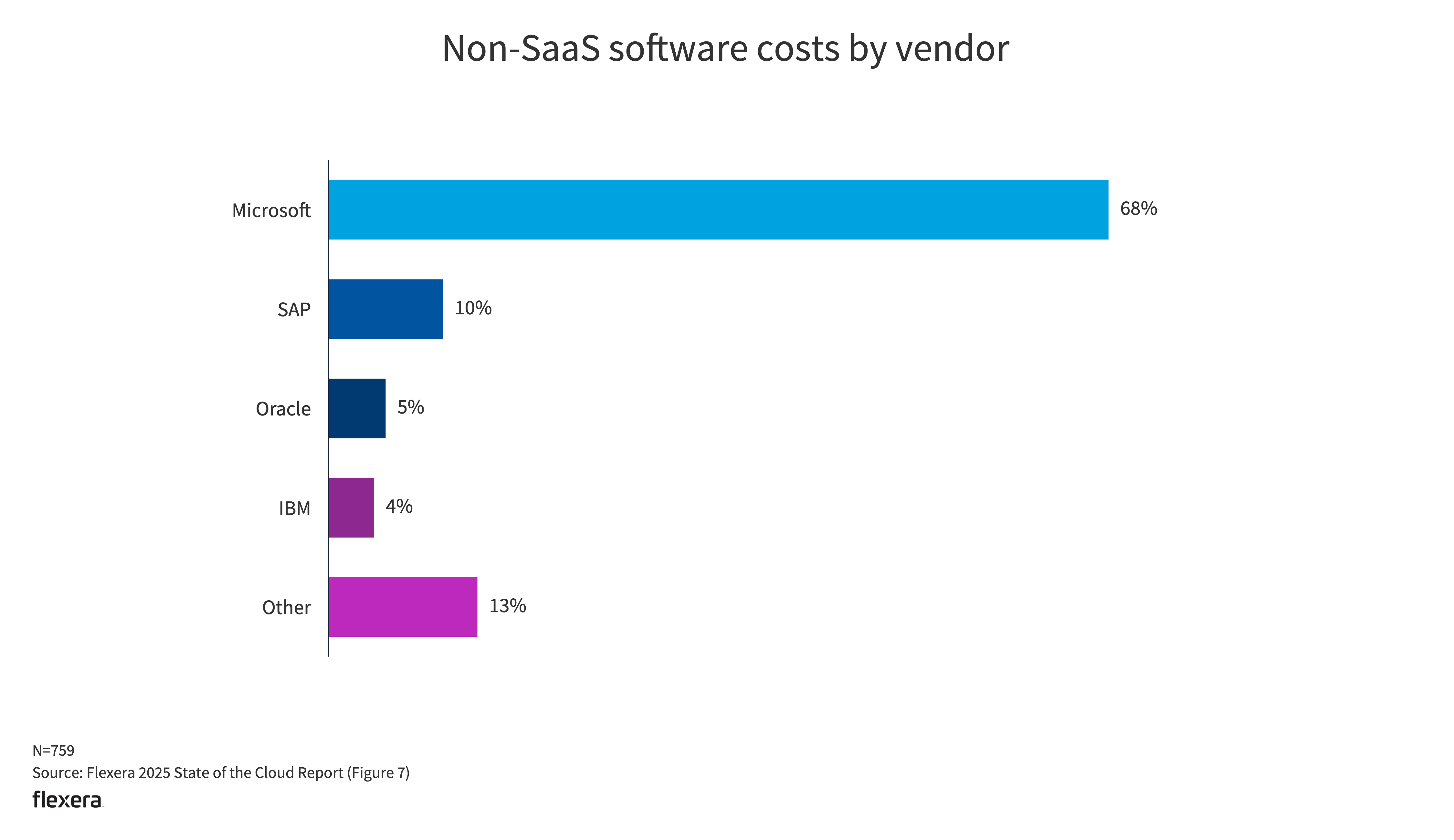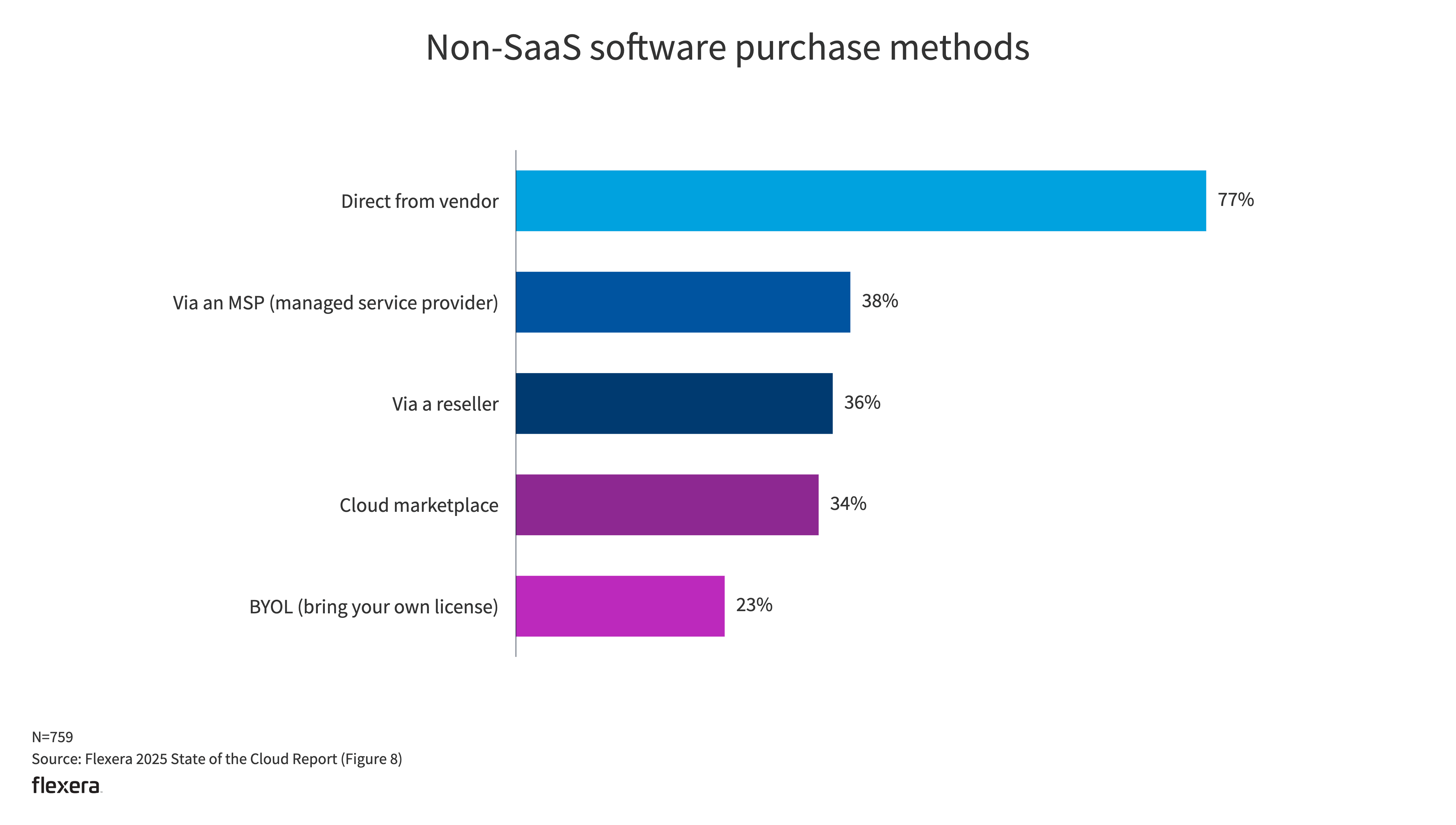 Not surprisingly, Microsoft is the most common non-SaaS vendor. The use of cloud marketplaces also increased (28% to 34%), with the use of other vendors dropping. This indicates a possible interesting trend that we’ll track moving forward. Organizations are taking on more responsibility to acquire software on their own and aren’t involving other vendors or resellers. MSP numbers remained flat, indicating that organizations that are getting their cloud services from an MSP most likely also get their software licenses from that MSP.