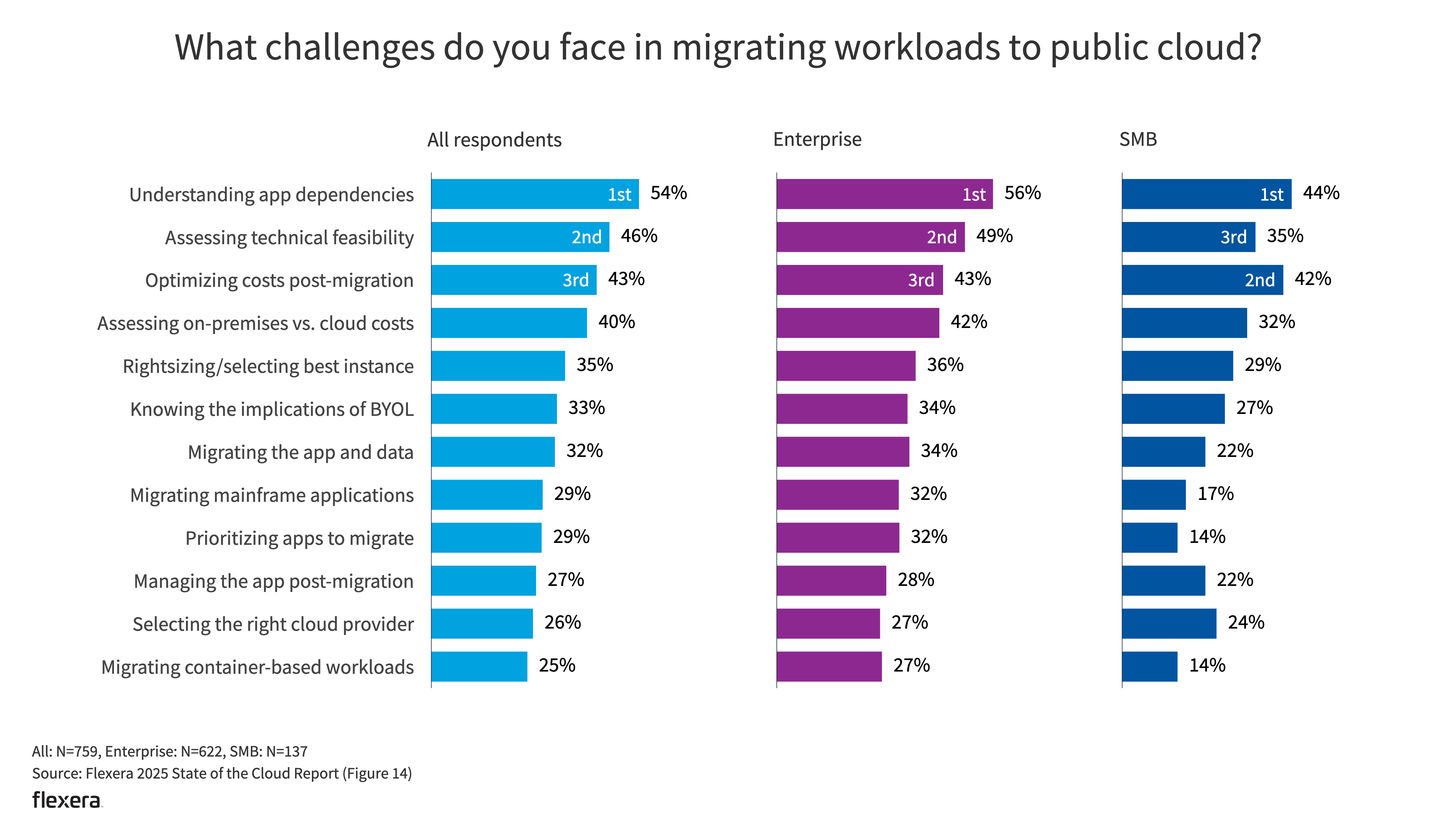 The top challenges for migrating workloads to the cloud are consistent across organization sizes year after year: Understanding app dependencies and assessing technical feasibility always seem to be the top two.